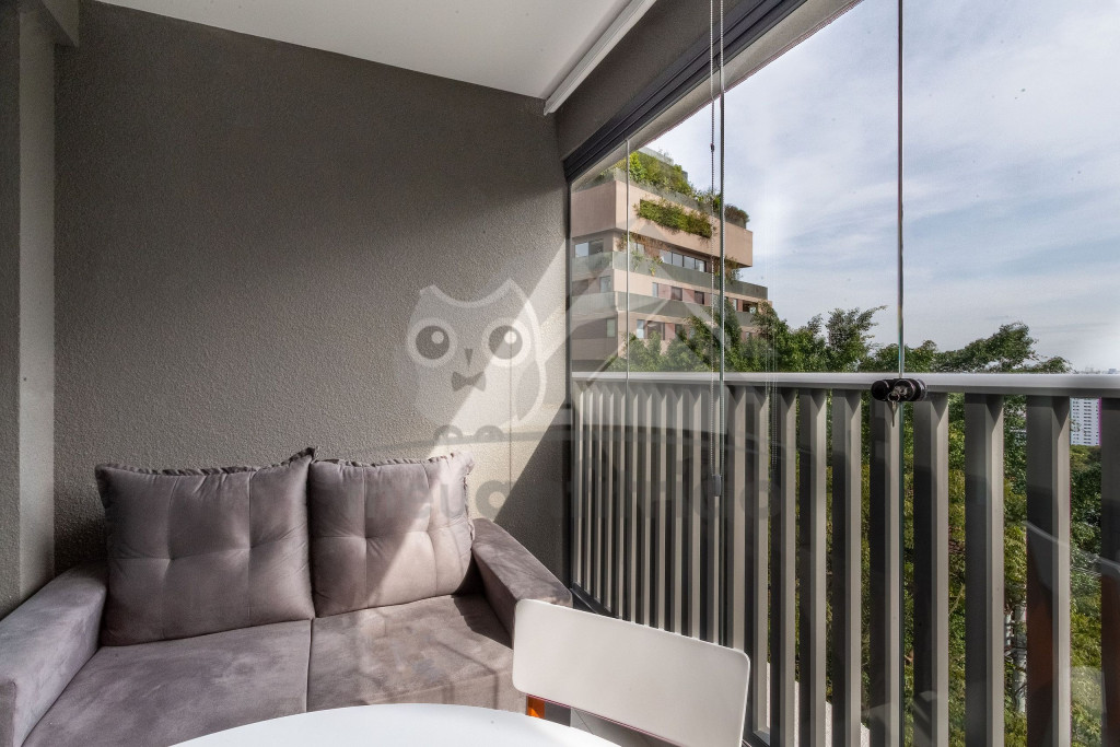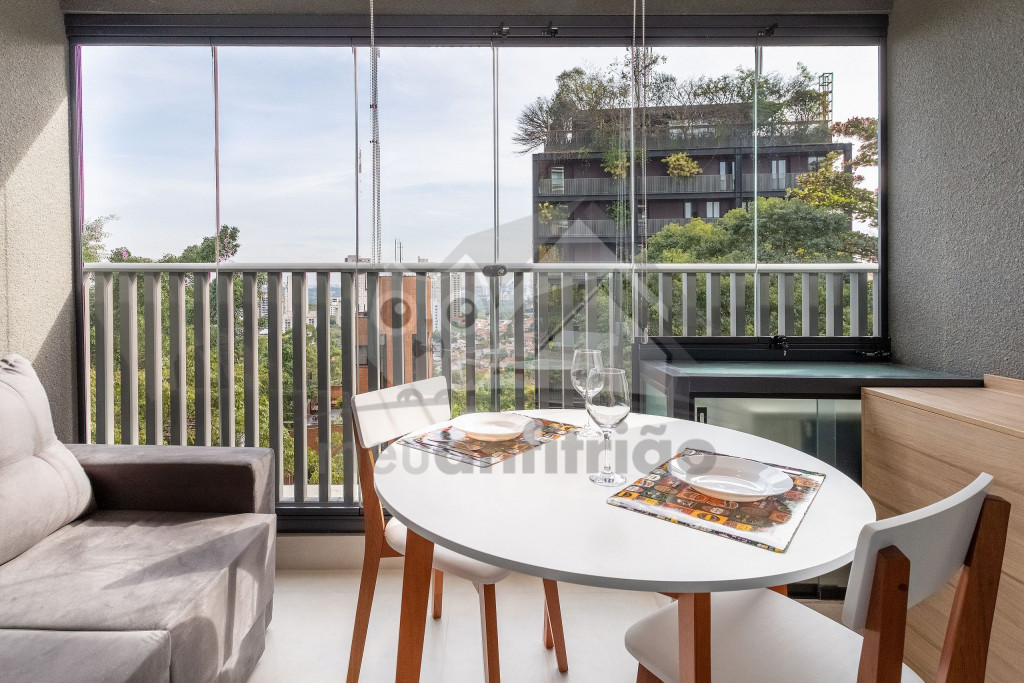 Uma varanda com porta de vidro separa os espaços. No local, há uma mesa com cadeiras para fazer refeições e um sofá. A vista é o ponto alto de nosso studio, que fica no último andar do condomínio.