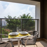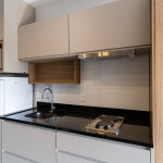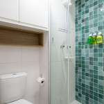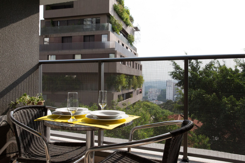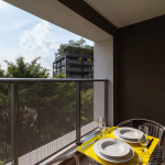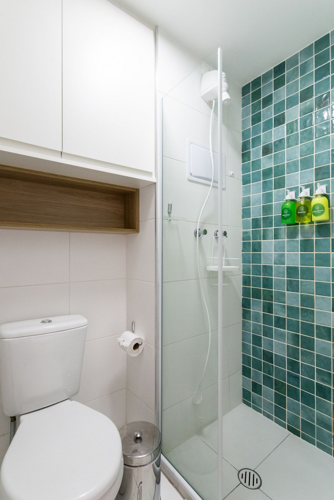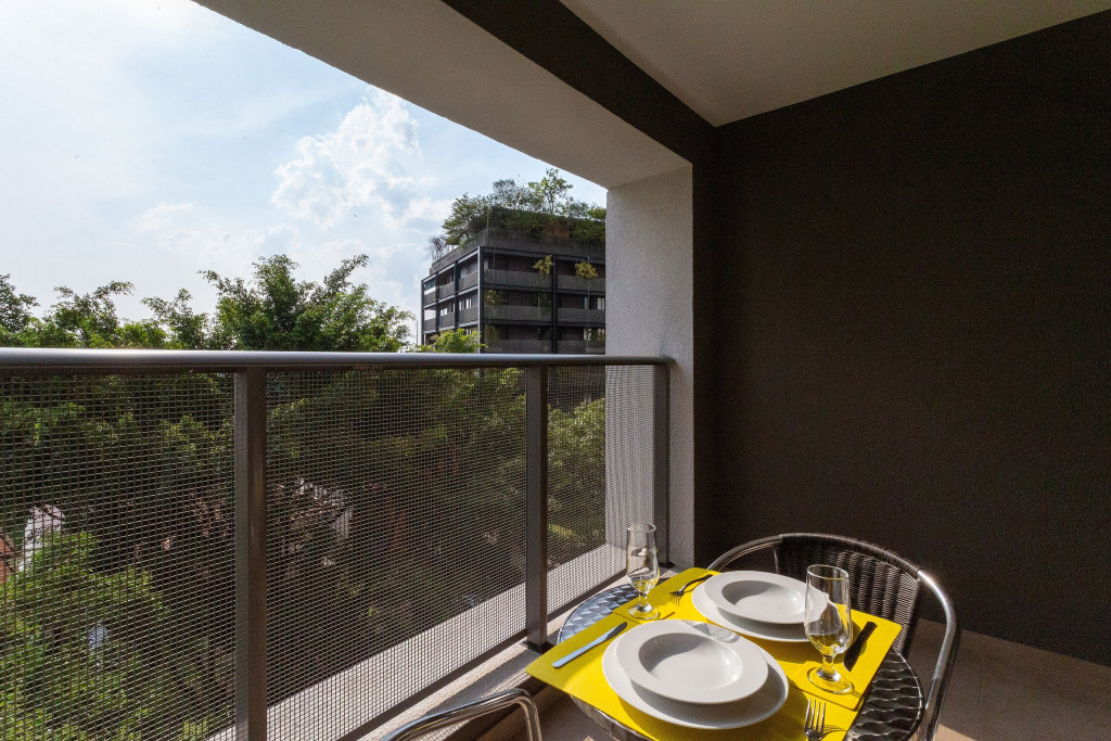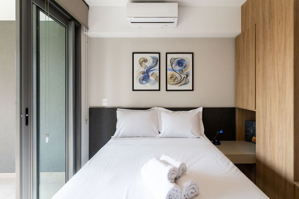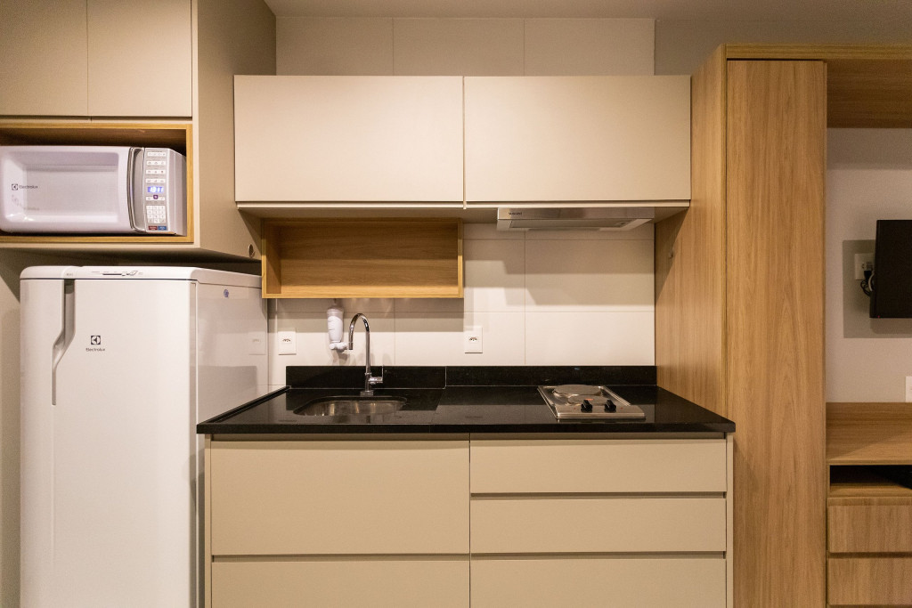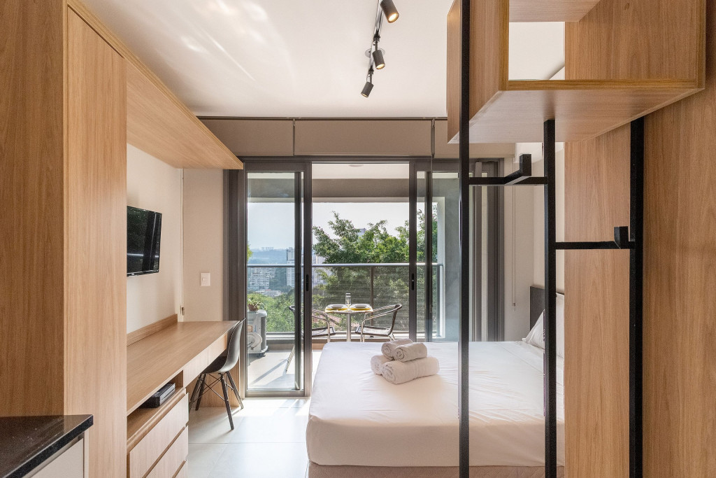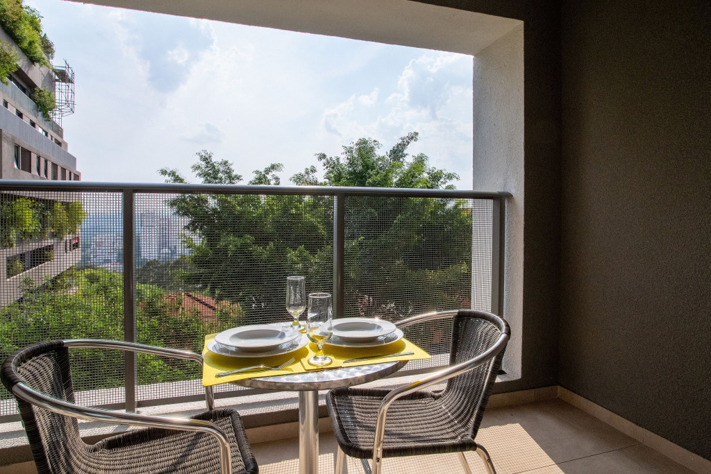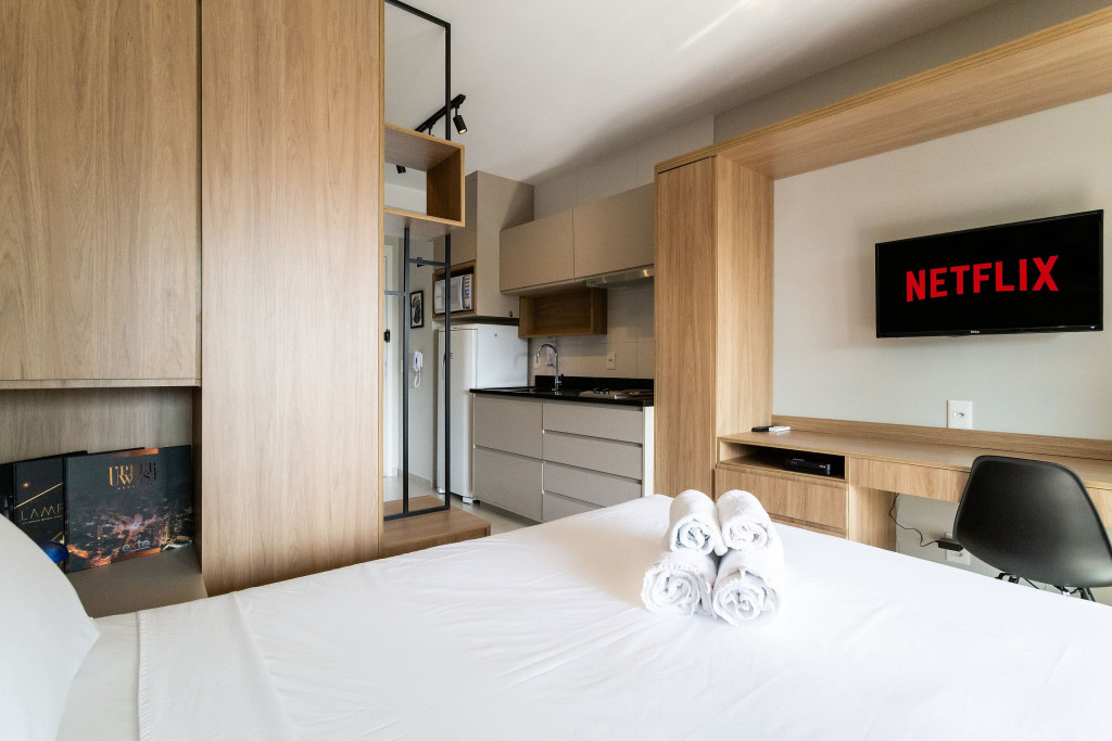 No mesmo ambiente dispomos de uma cozinha com utensílios necessários para uma estadia prática, banheiro, armário, escrivaninha para home office e TV Smart. Uma varanda com porta de vidro separa os espaços. No local, há uma mesa com cadeiras para fazer refeições. Dispomos, também, de ar-condicionado e aquecedor à óleo para dias mais frios.