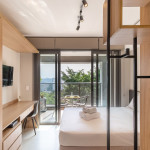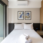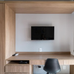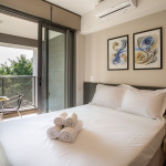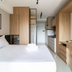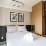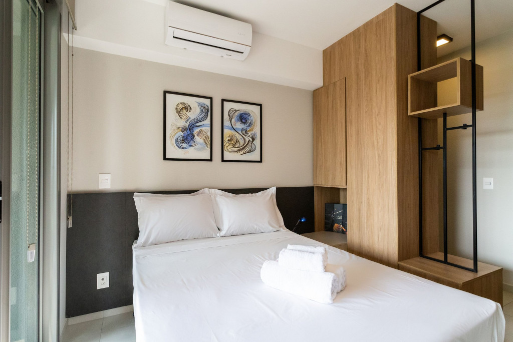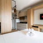 O ambiente do studio é em conceito aberto e acomoda até 2 pessoas em cama de casal.