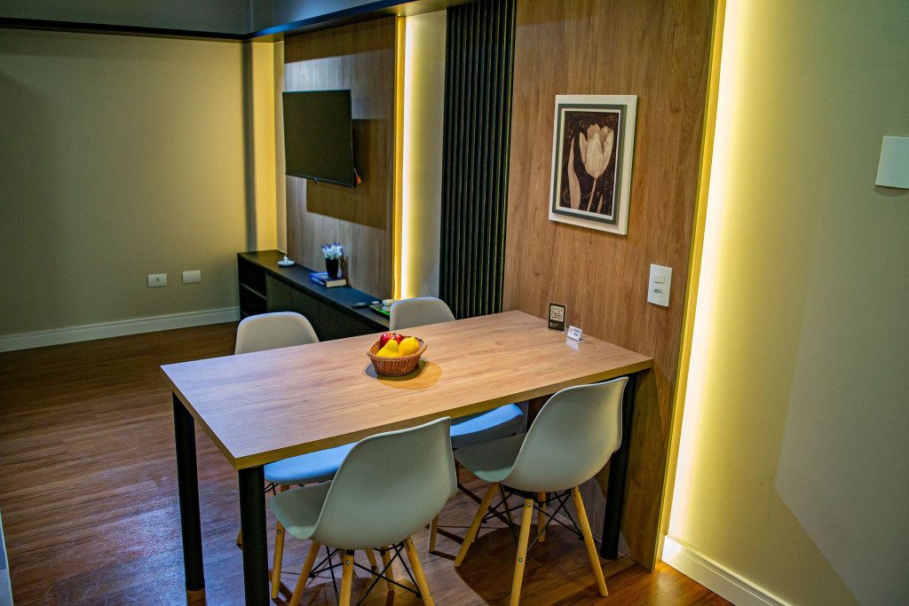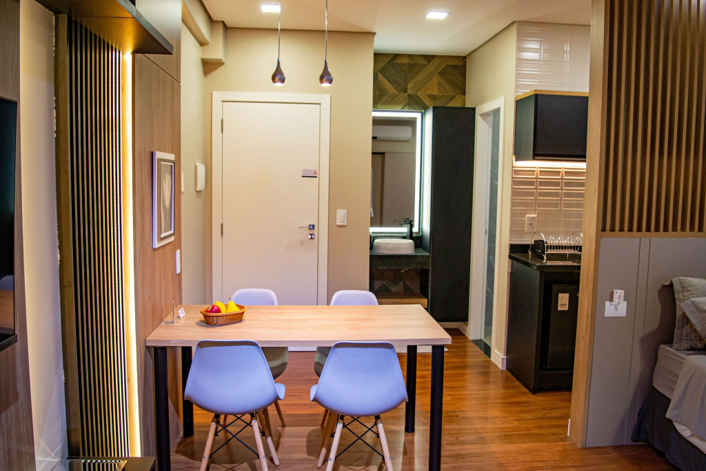 Seus apartamentos contam com cozinha equipada, Smart tv, cama confortável, ar-condicionado que refrigeram todo o espaço, central de trabalho/estudos, enxoval de cama e banho.