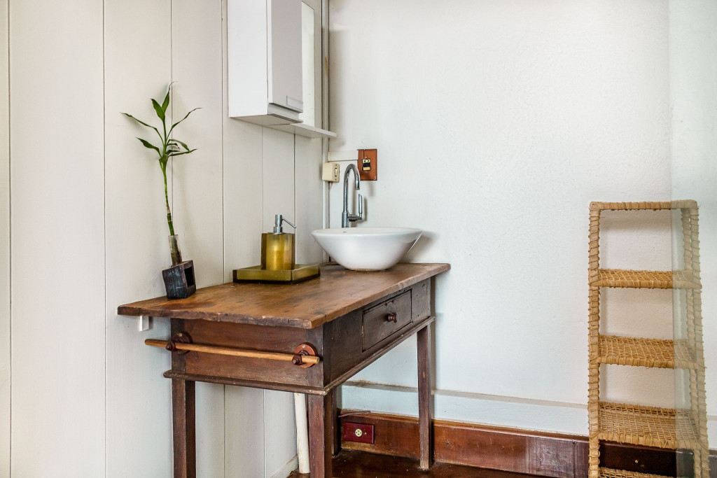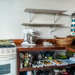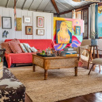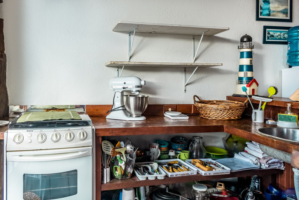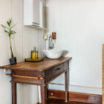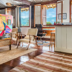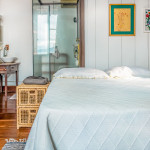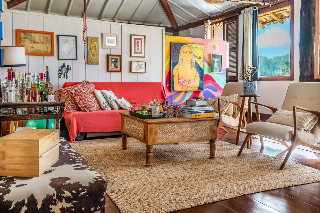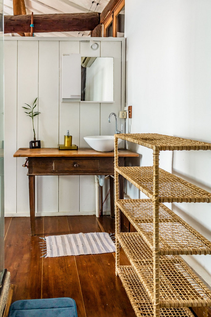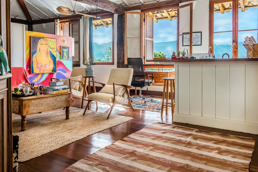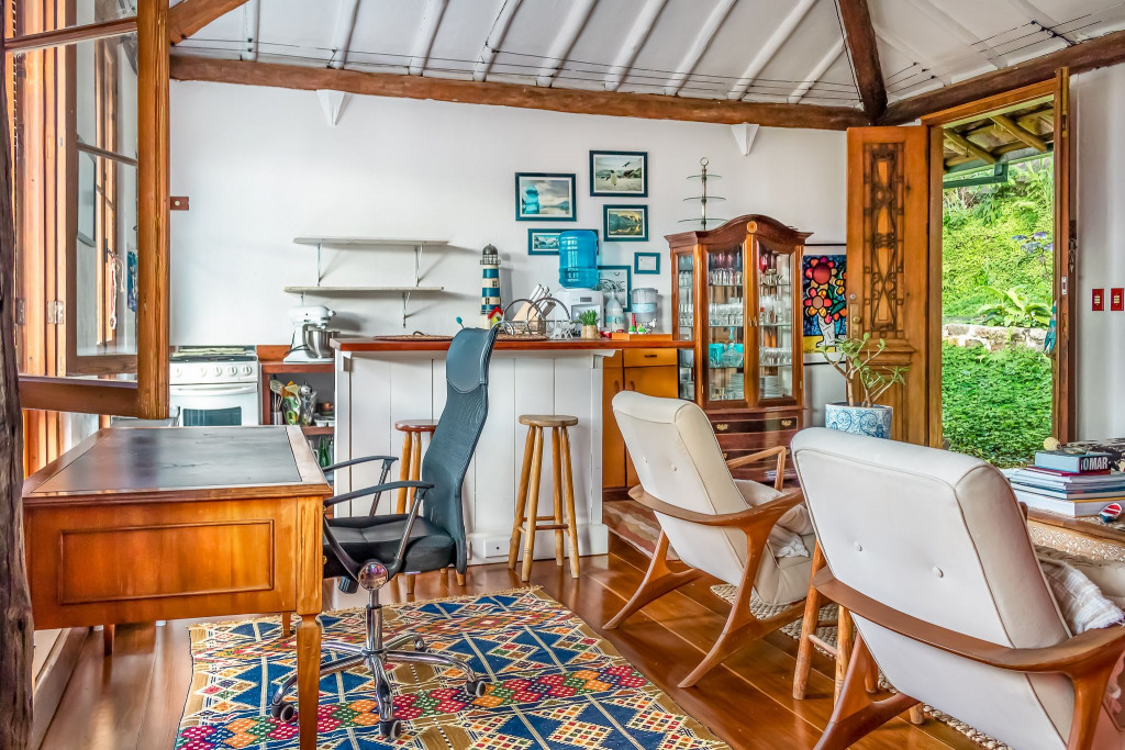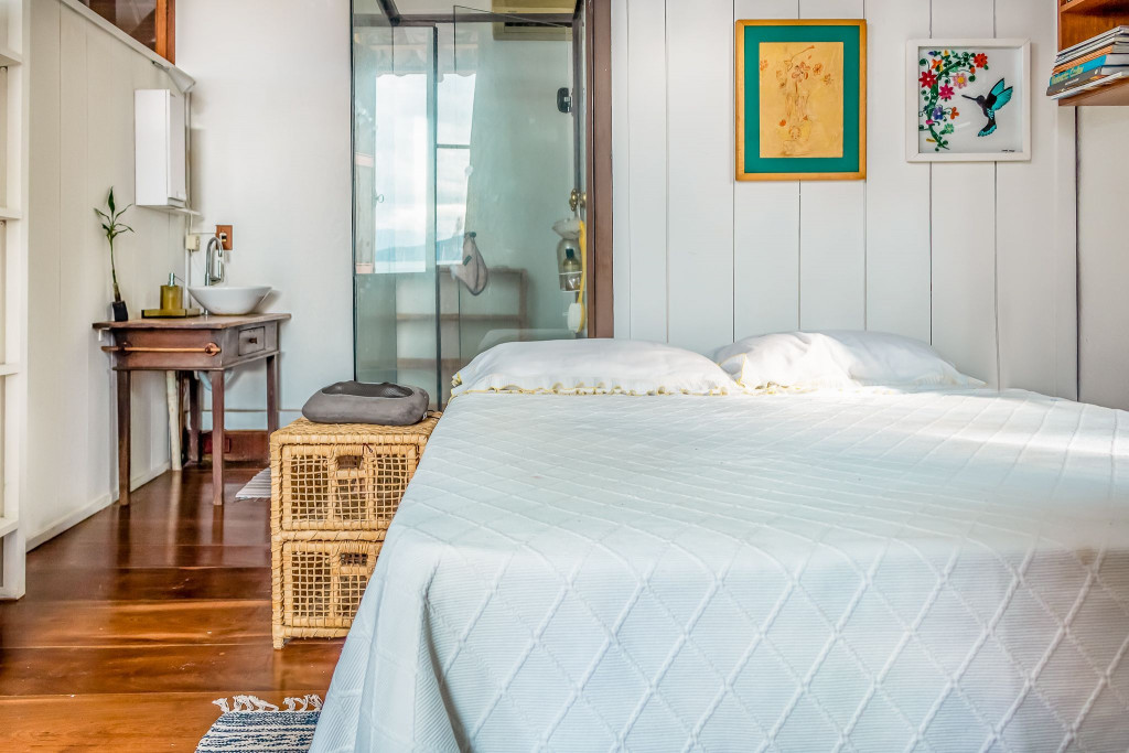 O espaço é em conceito aberto e conta com sala com sofá e poltronas, cozinha americana compacta com todos os utensílios necessários para uma estadia prática e balcão com banquetas. Há uma divisória que separa o ambiente do quarto que conta com cama de casal e banheiro.