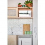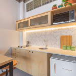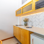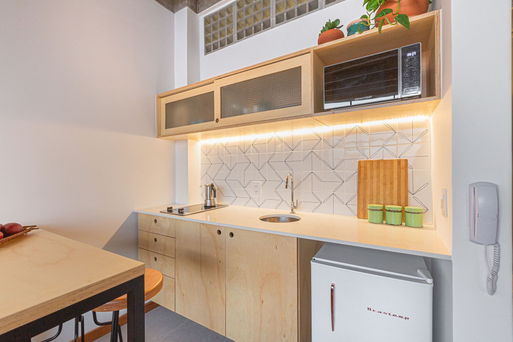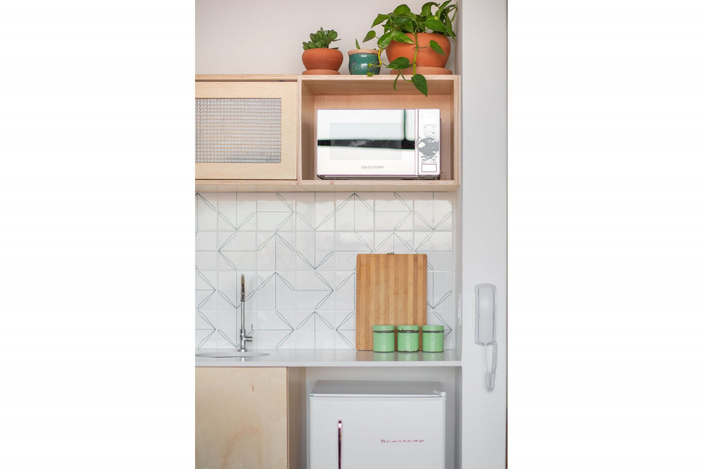 Os azulejos da cozinha foram especialmente escolhidos pelos traços inspirados em um dos maiores artistas brasileiros, Athos Bulcão, cujas obras compõem murais do Brasil inteiro, especialmente Brasília em projetos compartilhados com Oscar Niemeyer.