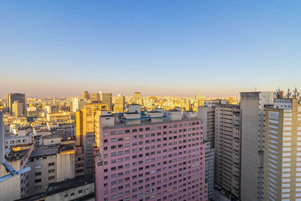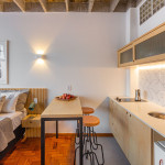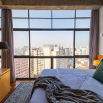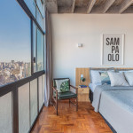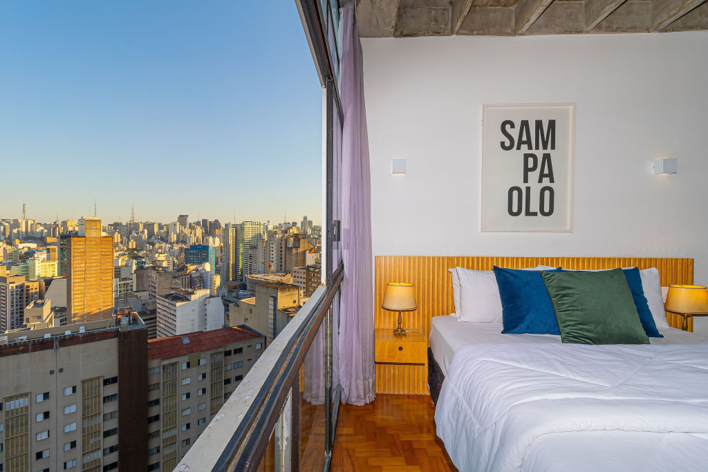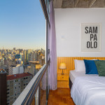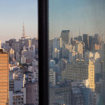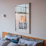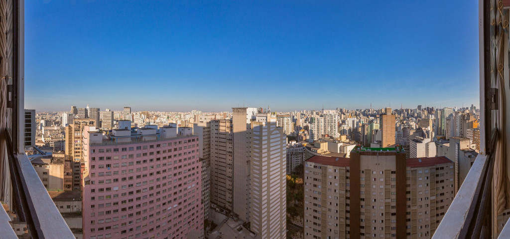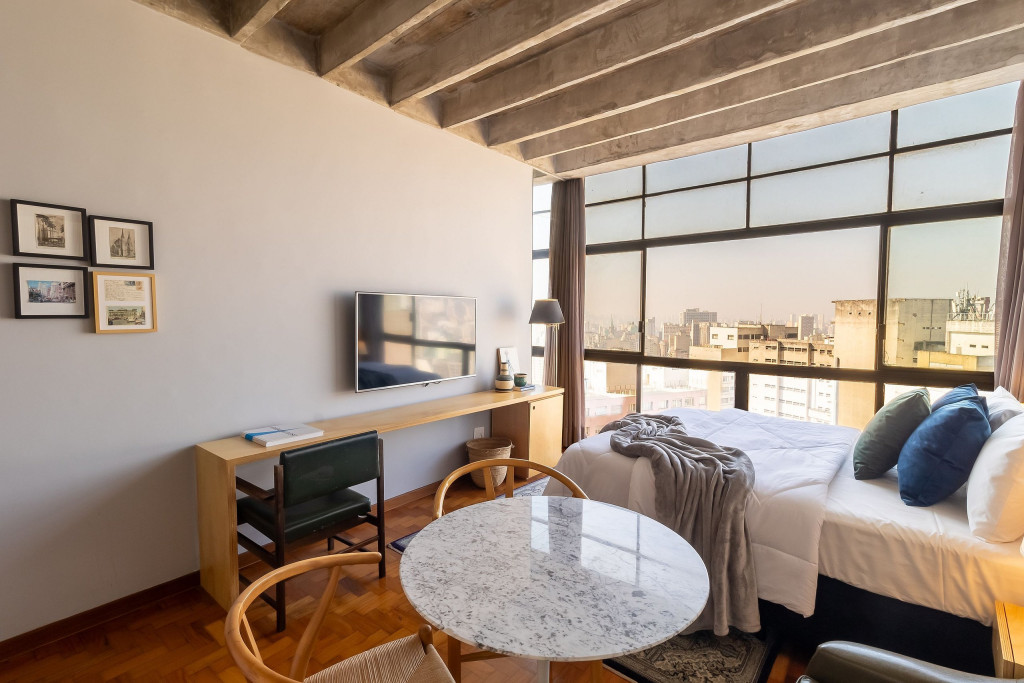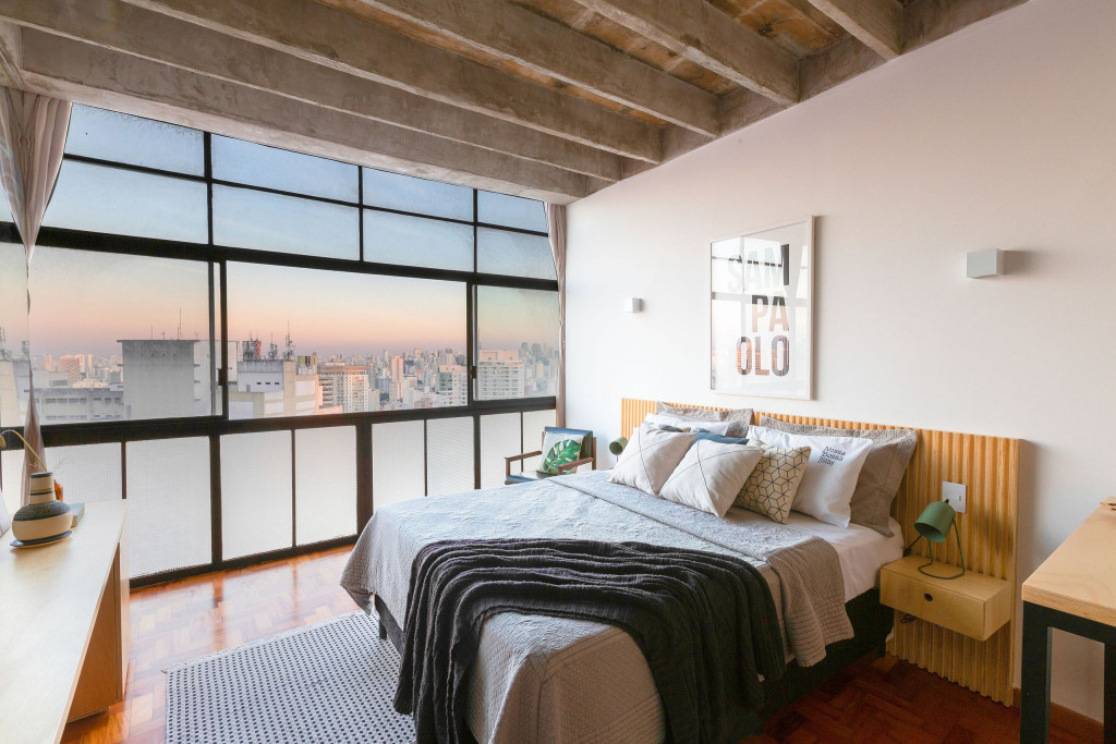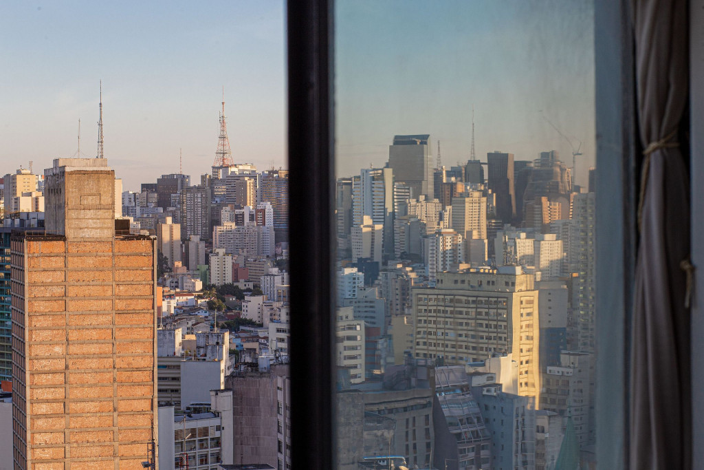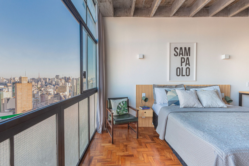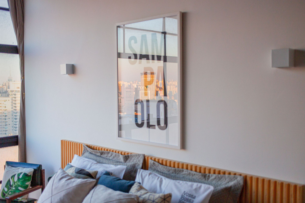 Os detalhes estão em todos os cantos do projeto, a começar pela grande e típica janela do Copan, que possui essa vista ímpar do vigésimo quinto andar. Manteve-se o vidro aramado na parte inferior que, além de manter a originalidade e charme do projeto de Niemeyer, dá muito mais segurança contra possíveis quebras acidentais. Esse mesmo vidro especial pode ser visto também no armário de cozinha, em cima da pia.
