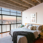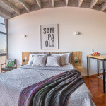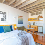 Toda a forração do teto foi retirada, expondo as estilosas vigas paralelas de sustentação do Edifício e logo chama a atenção o elemento vazado que abre ventilação para o banheiro. Ele é apelidado de cobogó e foi utilizado em diversas áreas do Copan além de amplamente incluído em projetos da época e por isso mereceu o espaço em nosso projeto.
