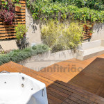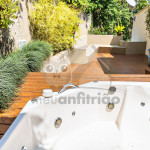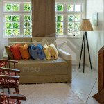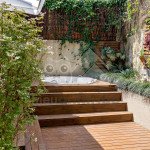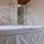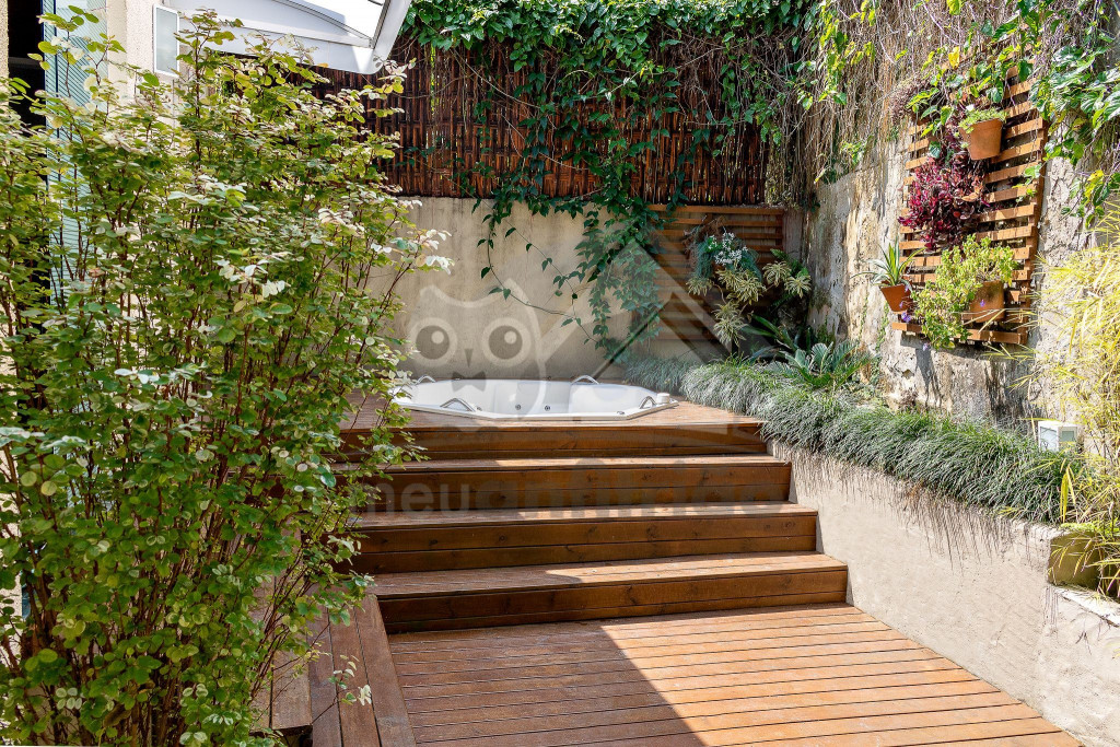 Subindo as escadas da sala, teremos um mezanino com cama de casal e mais um banheiro. Deste ambiente, será possível acessar um deck privativo com jacuzzi privativa de aquecimento a gás.