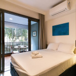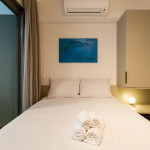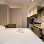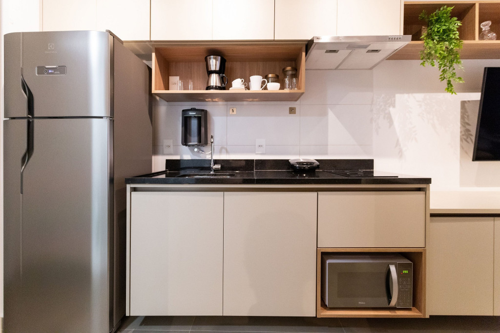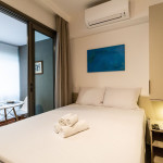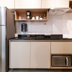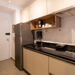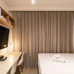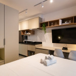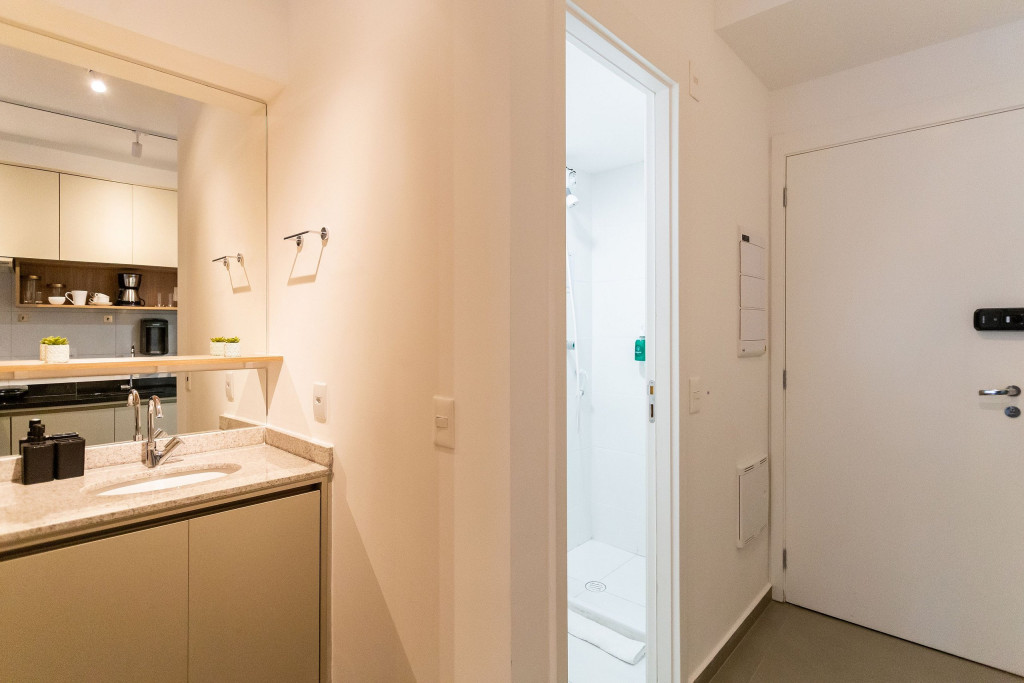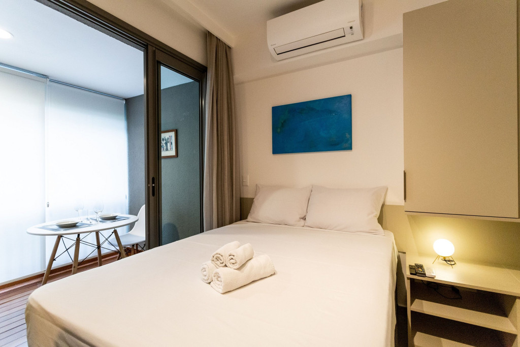 O studio está localizado no andar térreo do condomínio. O ambiente é em conceito aberto e acomoda até 2 pessoas em cama de casal. No mesmo ambiente dispomos de uma cozinha com utensílios necessários para a estadia, banheiro, armário, escrivaninha para home office e TV Smart.