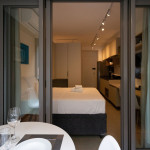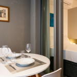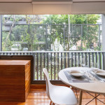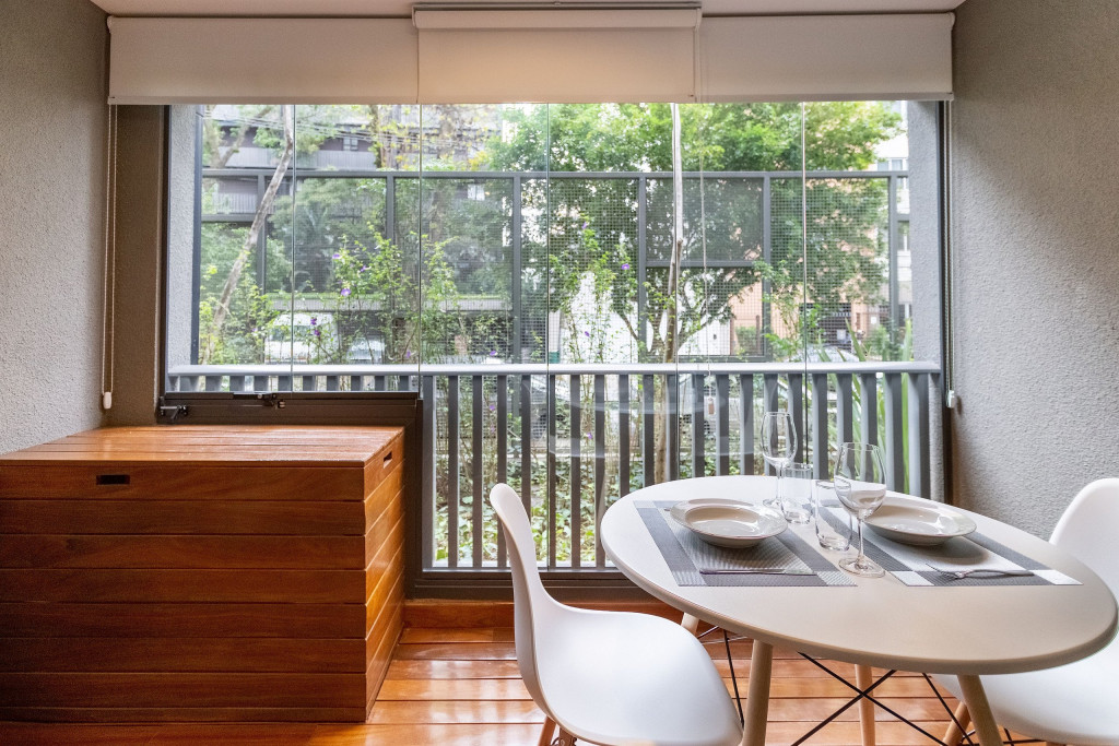 Uma varanda com porta de vidro separa os espaços. No local há uma mesa com cadeiras e para proveito do ambiente externo. Para um ambiente mais aconchegante, contamos com cortina blackout na divisão do apartamento para a sacada.