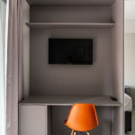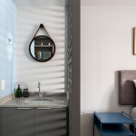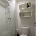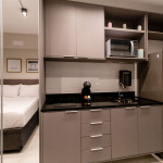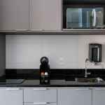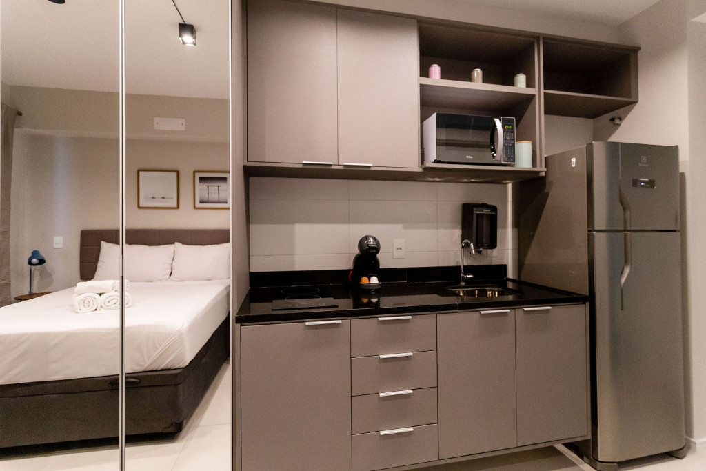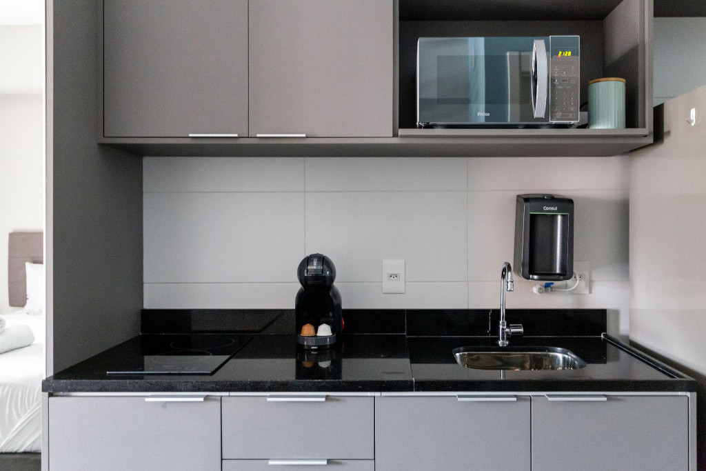 No mesmo ambiente dispomos de uma cozinha com utensílios necessários para uma estadia prática, banheiro, armário, escrivaninha para home office, TV Smart e cafeteira Nespresso, mas é necessário levar as próprias cápsulas. É possível comprá-las na loja de conveniência do condomínio que fica no térreo dentro do coworking.