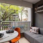 Uma varanda com porta de vidro separa os espaços. No local há uma mesa com cadeiras e sofá para aproveitar o ambiente externo.