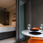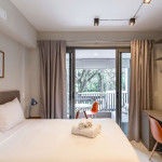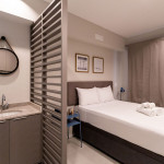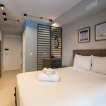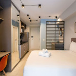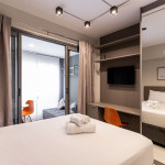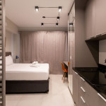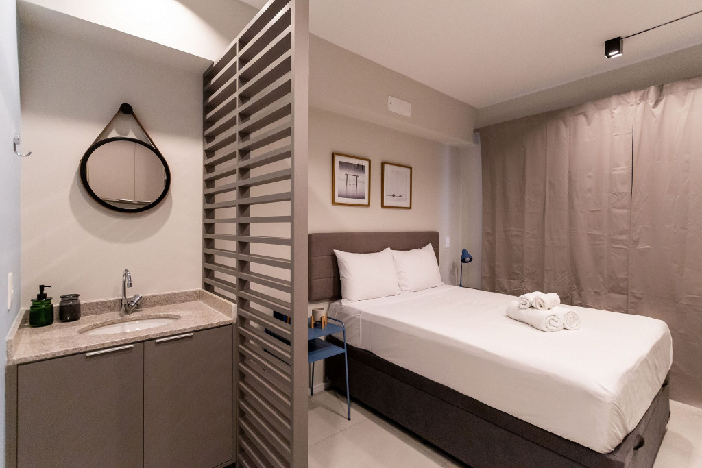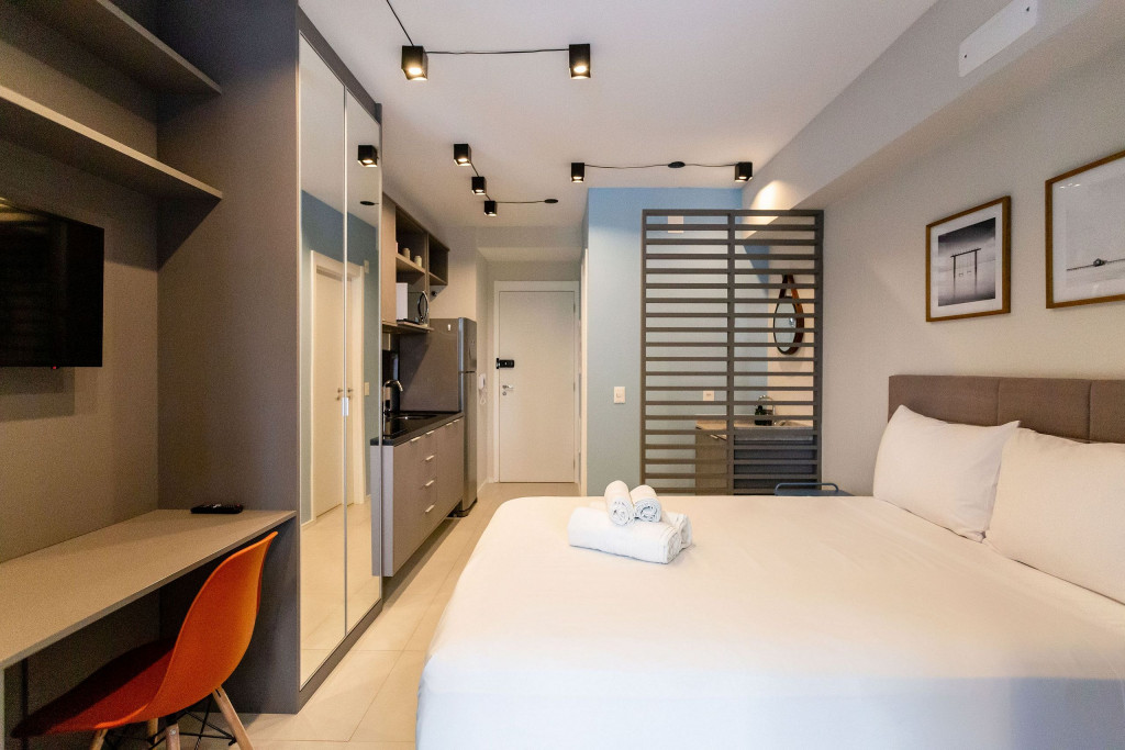 O ambiente do studio é em conceito aberto e acomoda até 2 pessoas em cama de casal.