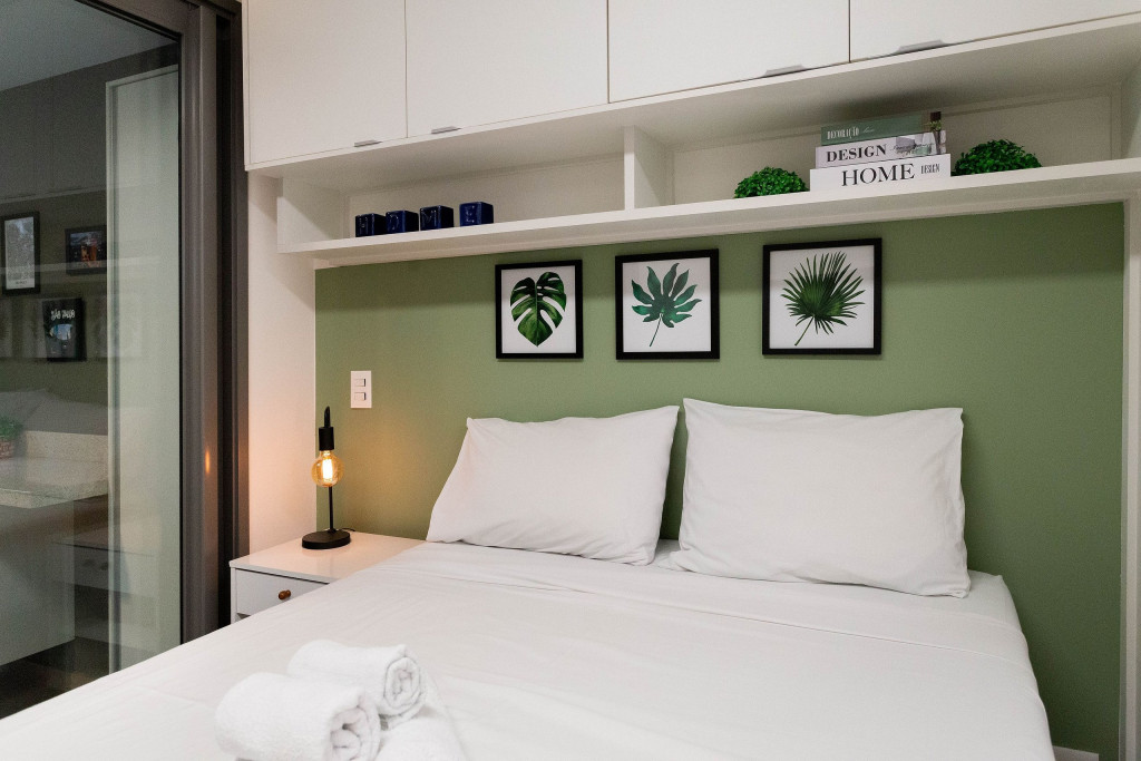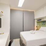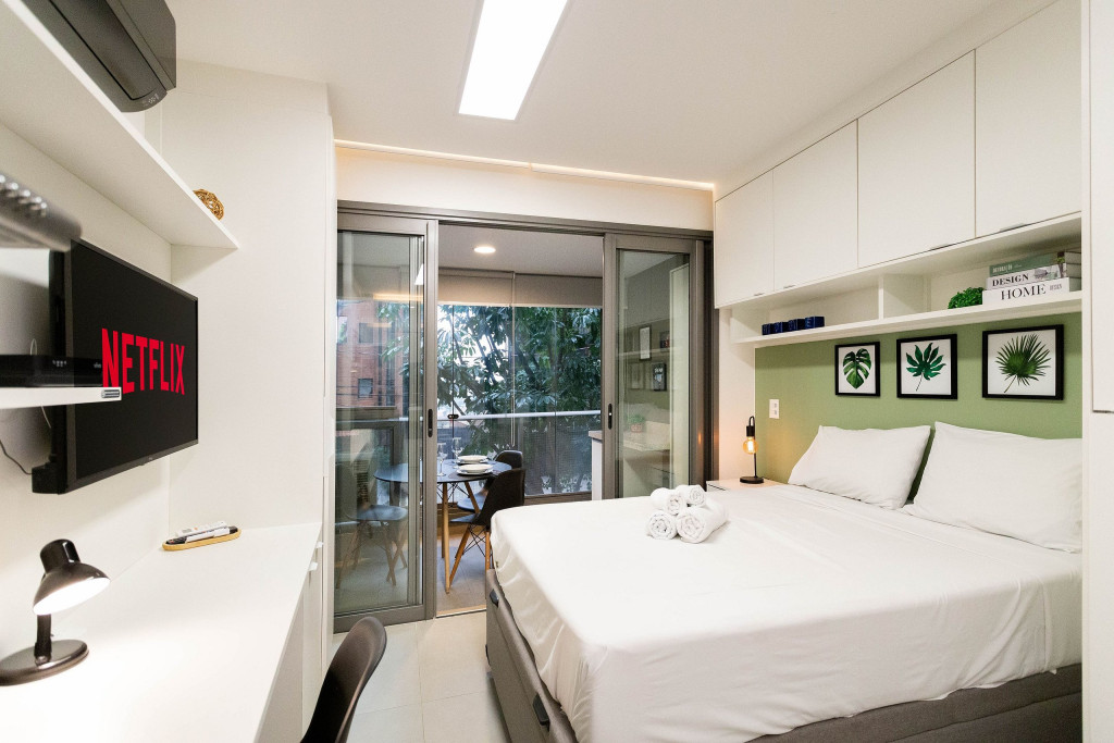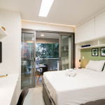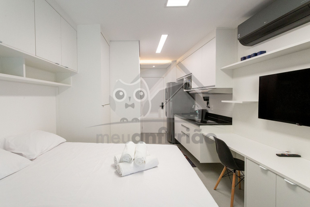 O ambiente do studio é em conceito aberto e acomoda até 2 pessoas em cama de casal.