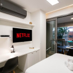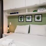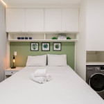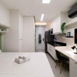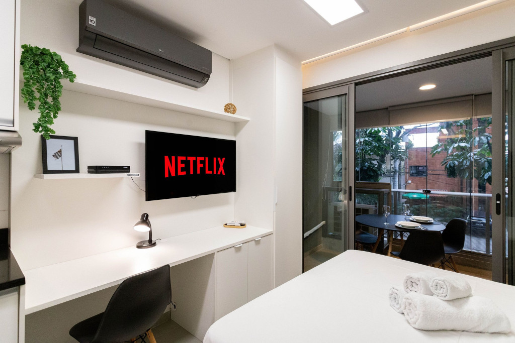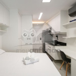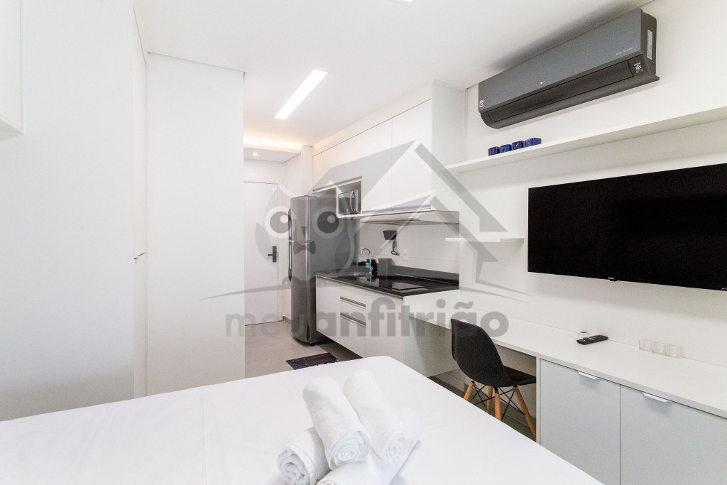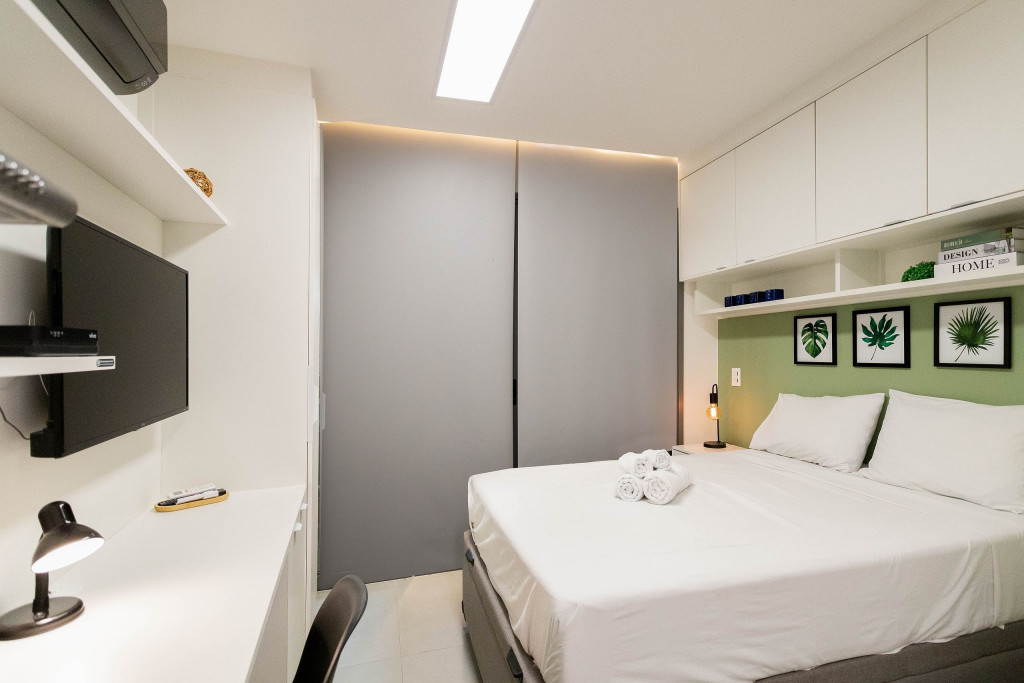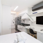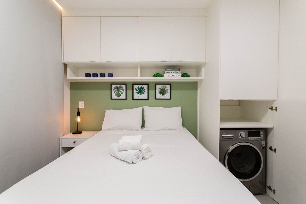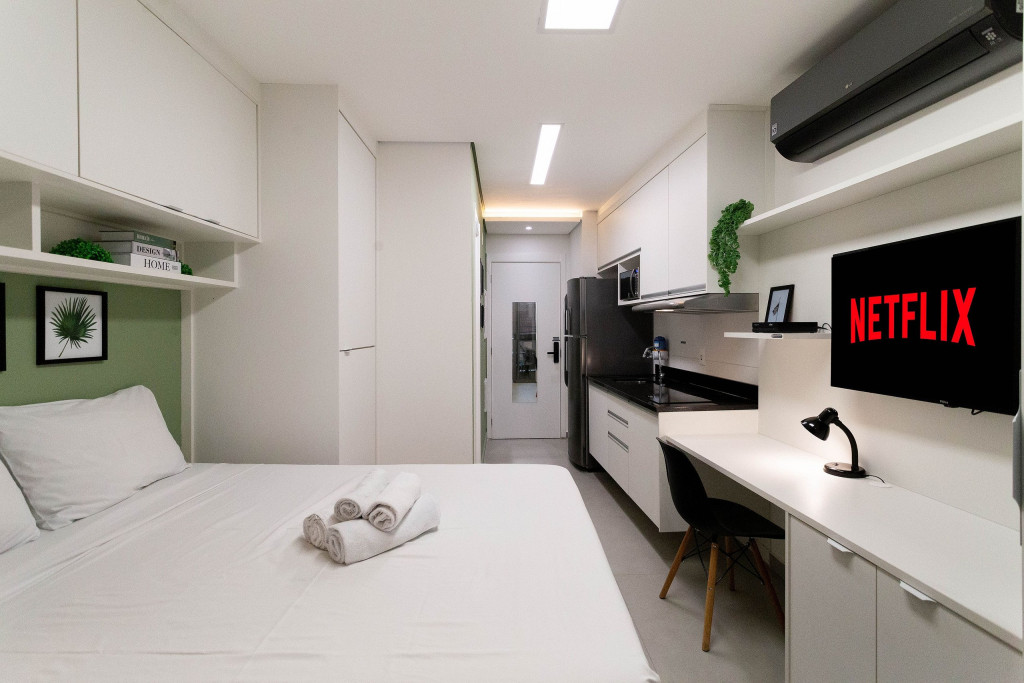 No mesmo ambiente dispomos de uma cozinha com utensílios necessários para uma estadia prática, banheiro, armário, escrivaninha para home office e TV Smart. Dentro do armário ainda possuímos uma máquina lava e seca.