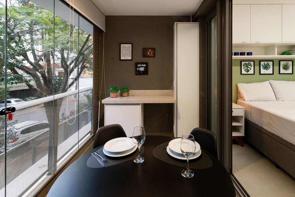 Uma varanda com porta de vidro separa os espaços. No local, há uma mesa com cadeiras para fazer refeições e outra escrivaninha. Dispomos, também, de ar-condicionado quente e frio e WI-FI de alta velocidade.