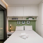 - Temos um mini futon dobrável no armário que serve para acomodar uma criança, se necessário. Em outros casos, o studio comporta somente até 2 pessoas em cama de casal.