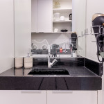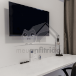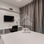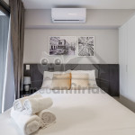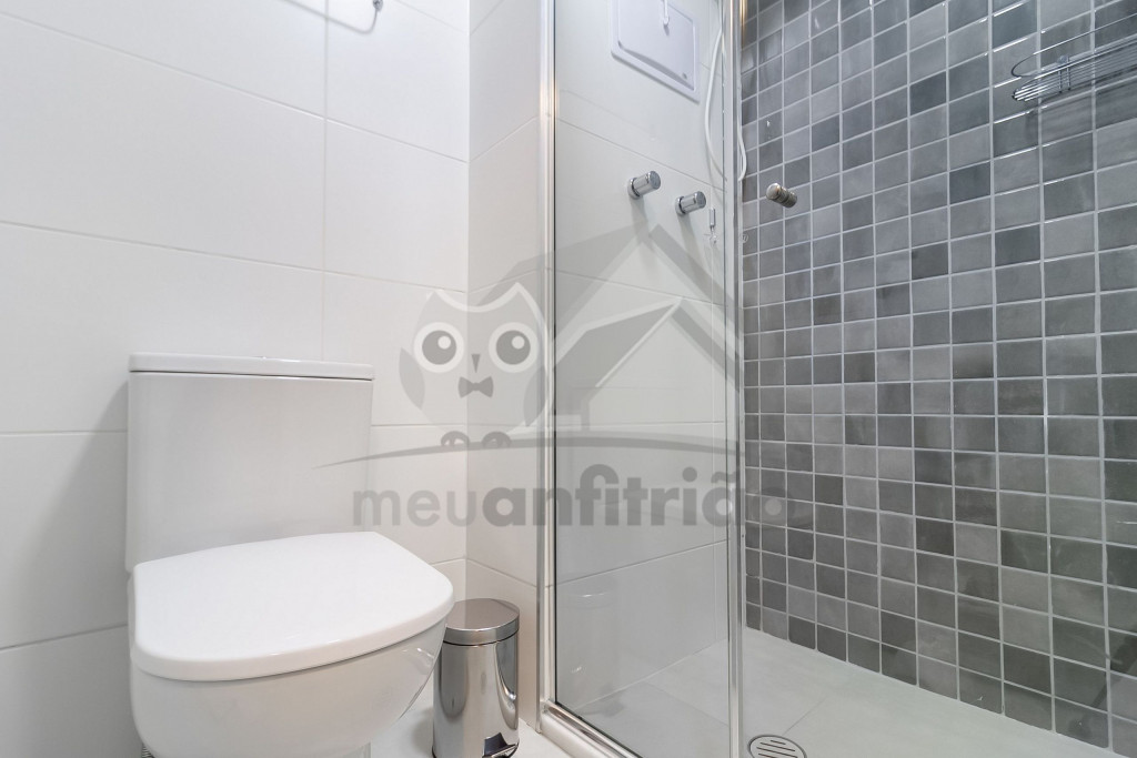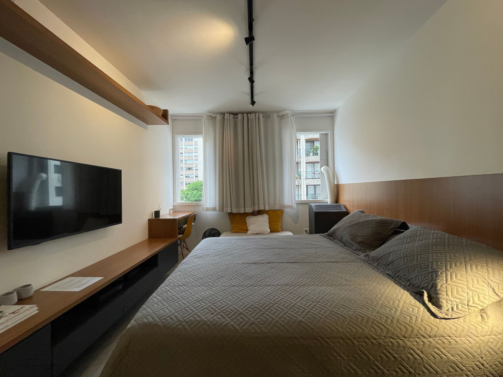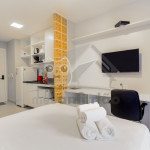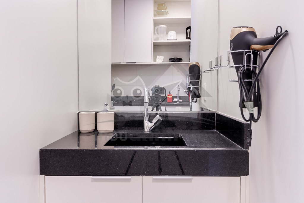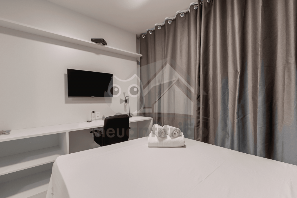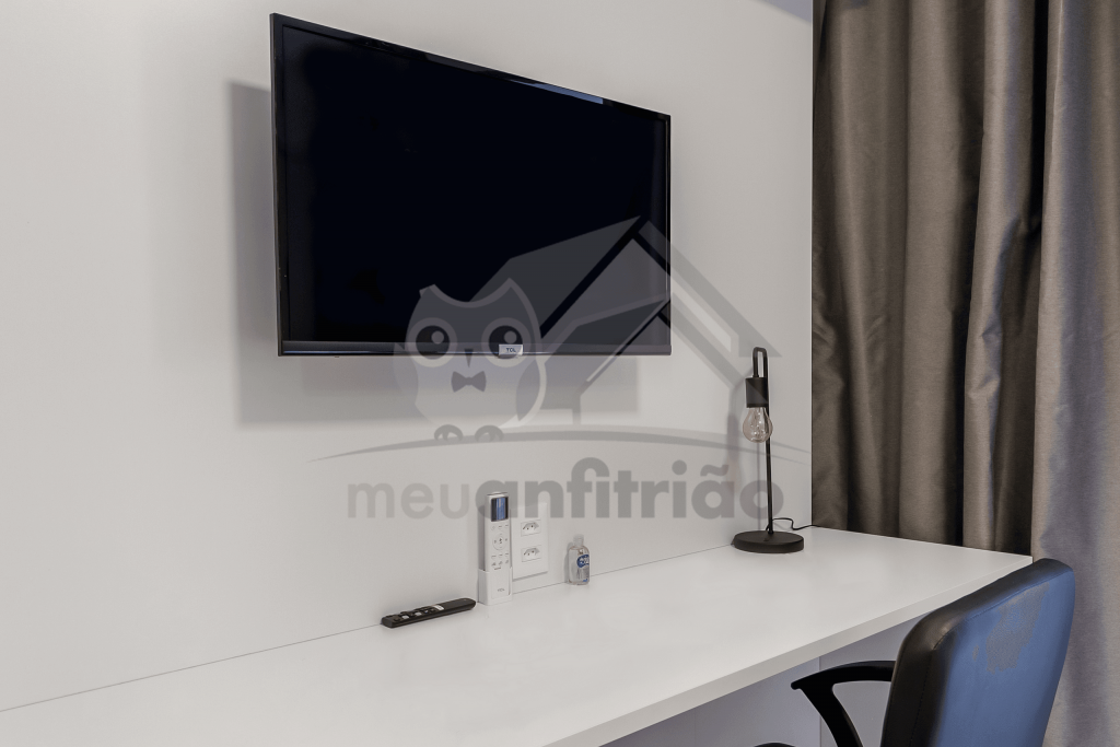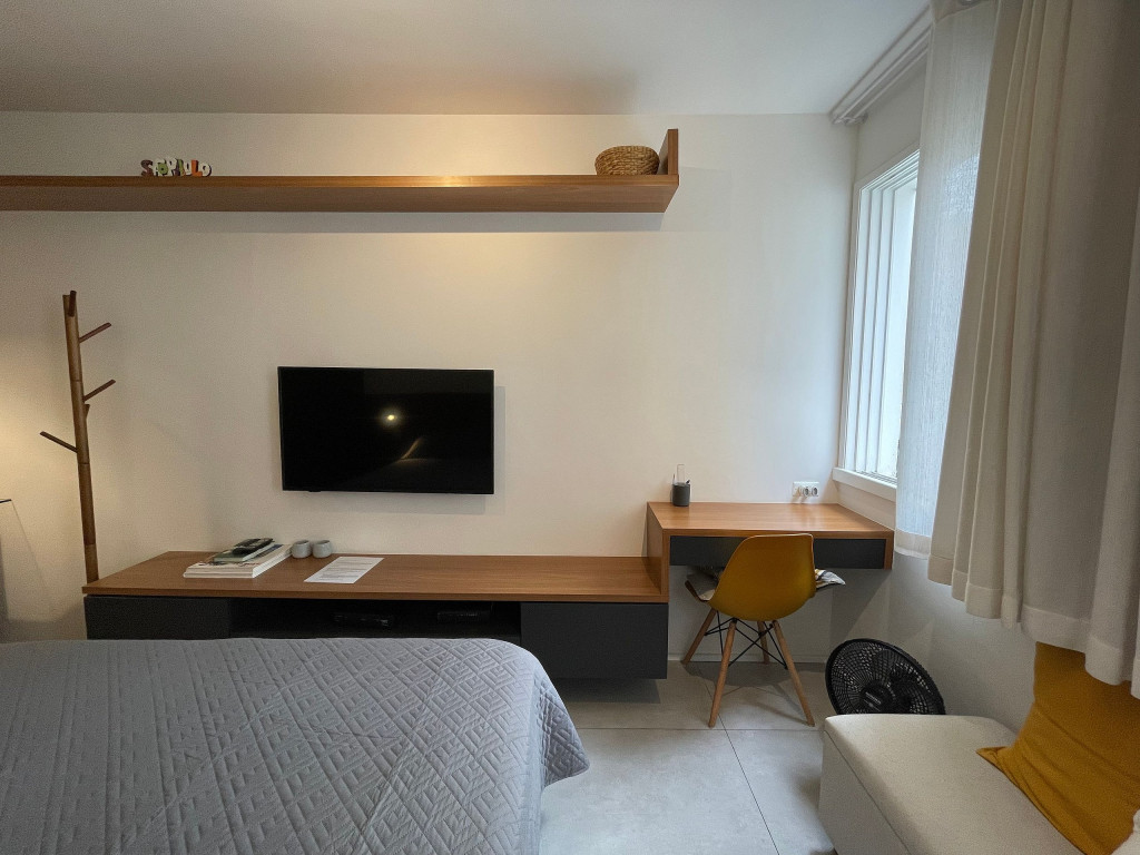 No mesmo ambiente dispomos de uma cozinha com utensílios necessários para uma estadia prática, banheiro, armário, escrivaninha para home office e TV Smart.