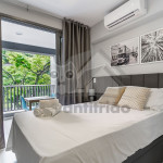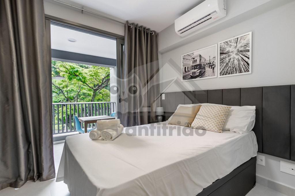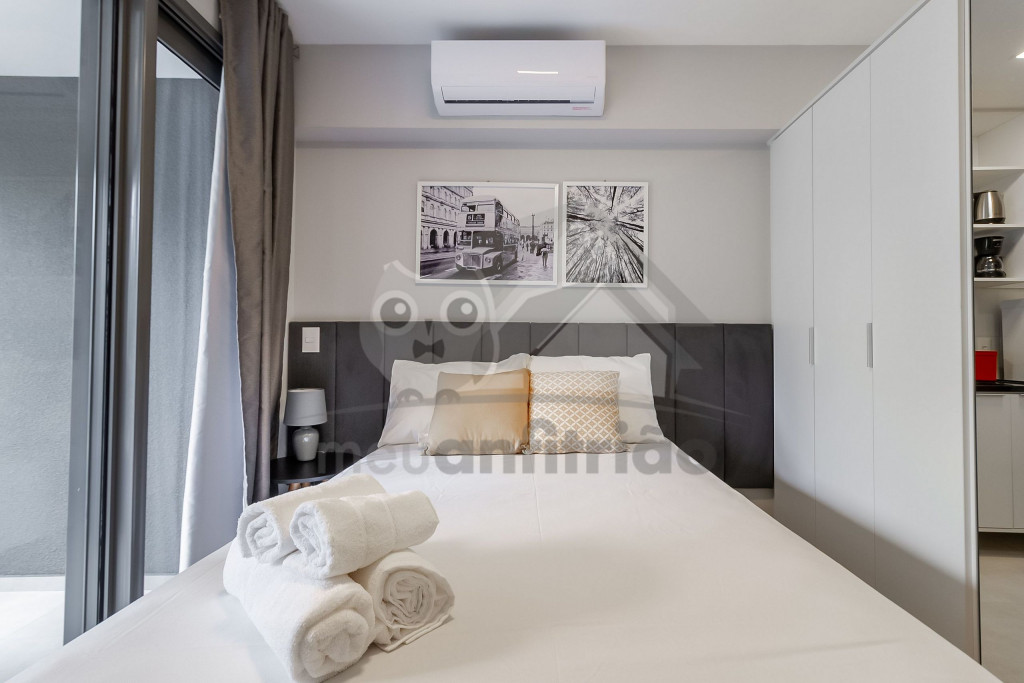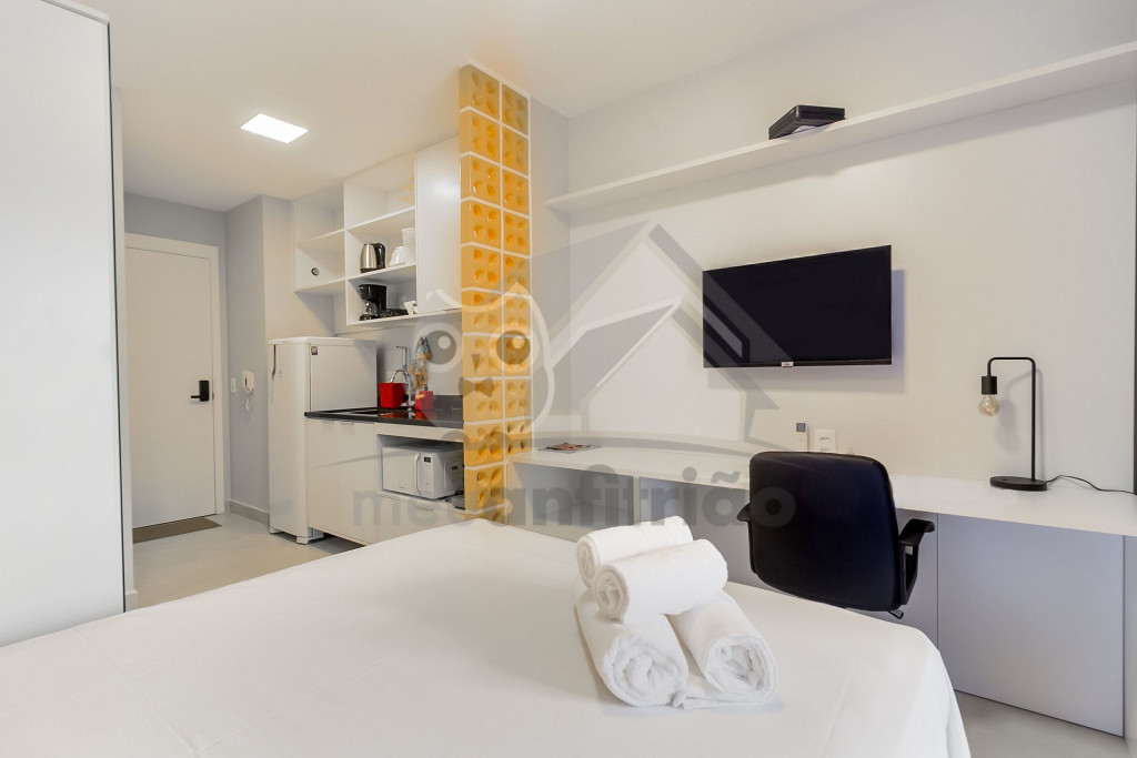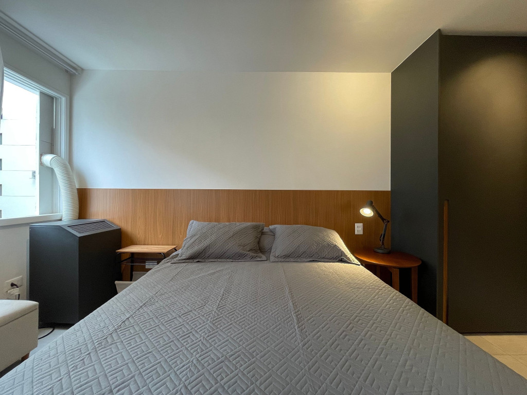 O ambiente do studio é em conceito aberto e acomoda até 2 pessoas em cama de casal.