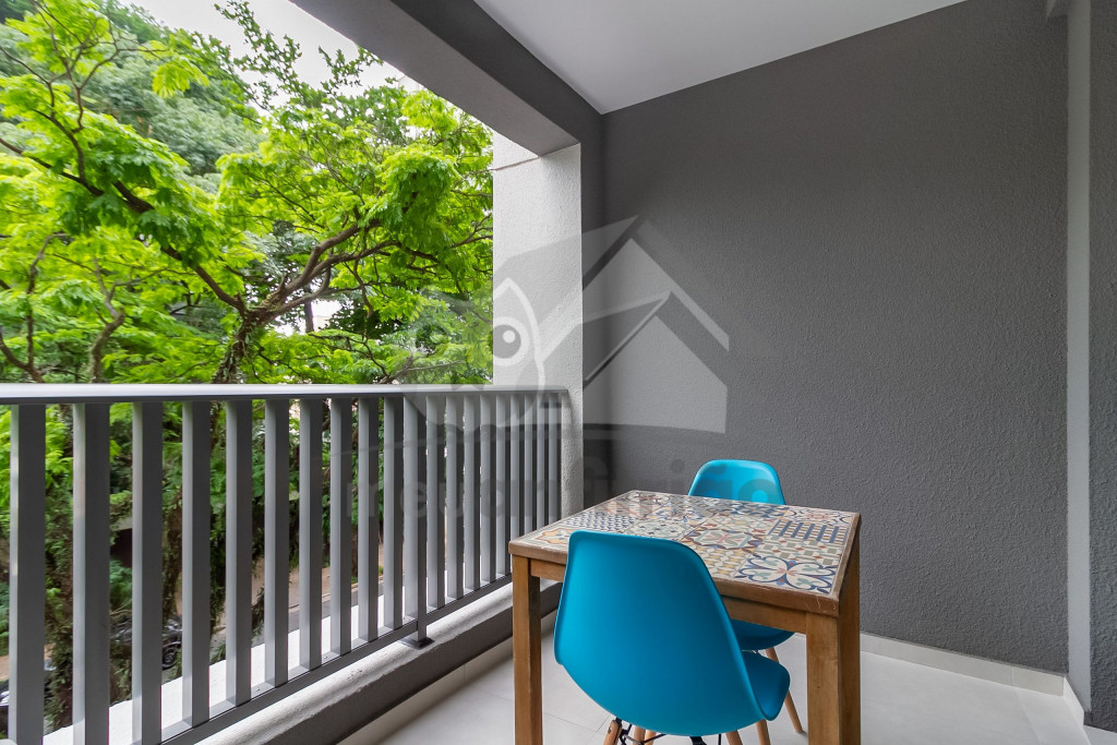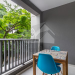 Uma varanda com porta de vidro separa os espaços. No local há uma mesa com cadeiras para fazer refeições e aproveitar o ambiente externo