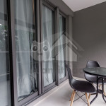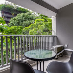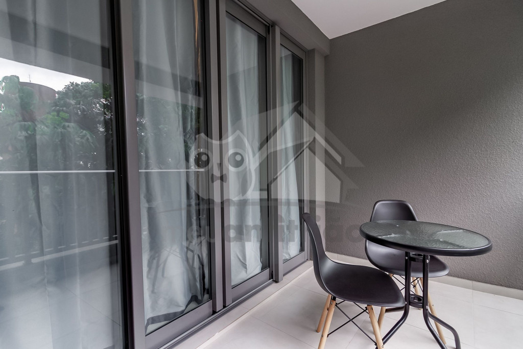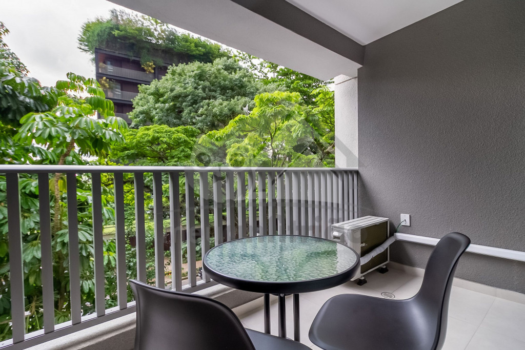 Uma varanda com porta de vidro separa os espaços. No local há uma mesa com cadeiras para fazer refeições e aproveitar o ambiente externo