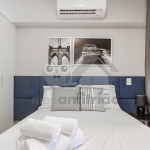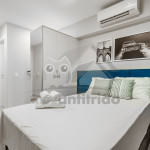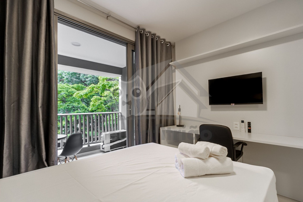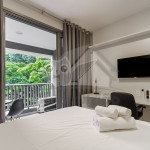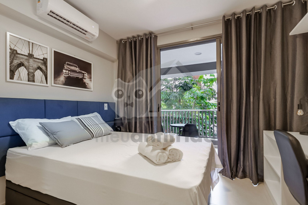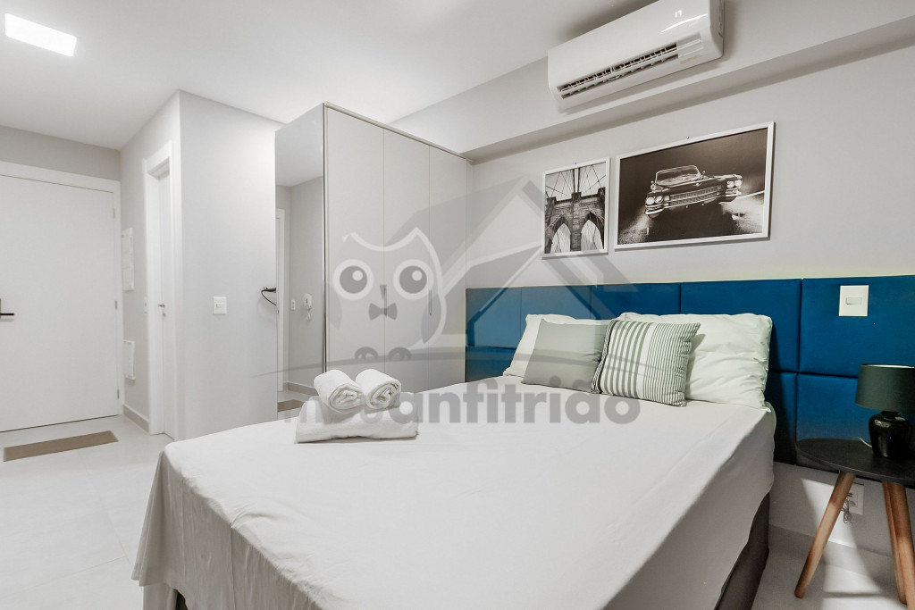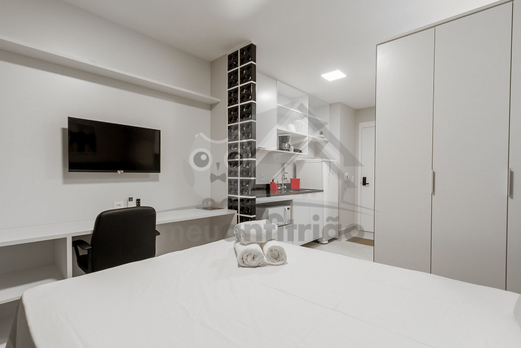 O ambiente do studio é em conceito aberto e acomoda até 2 pessoas em cama de casal.