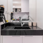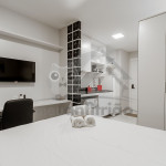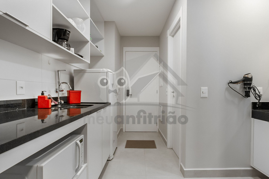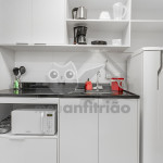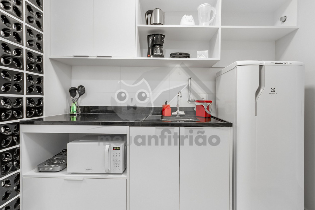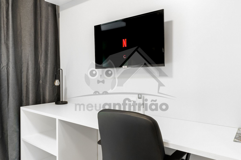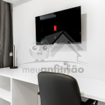 No mesmo ambiente dispomos de uma cozinha com utensílios necessários para a estadia, banheiro, armário, escrivaninha para home office e TV Smart.