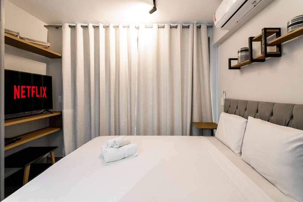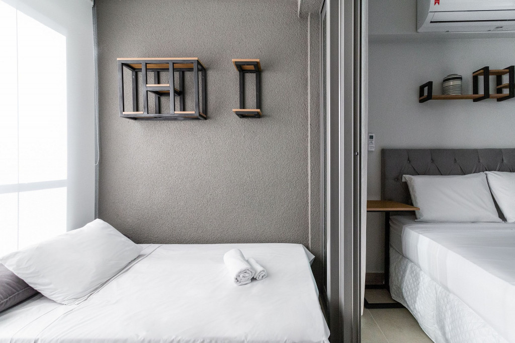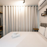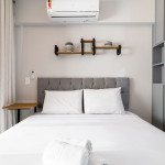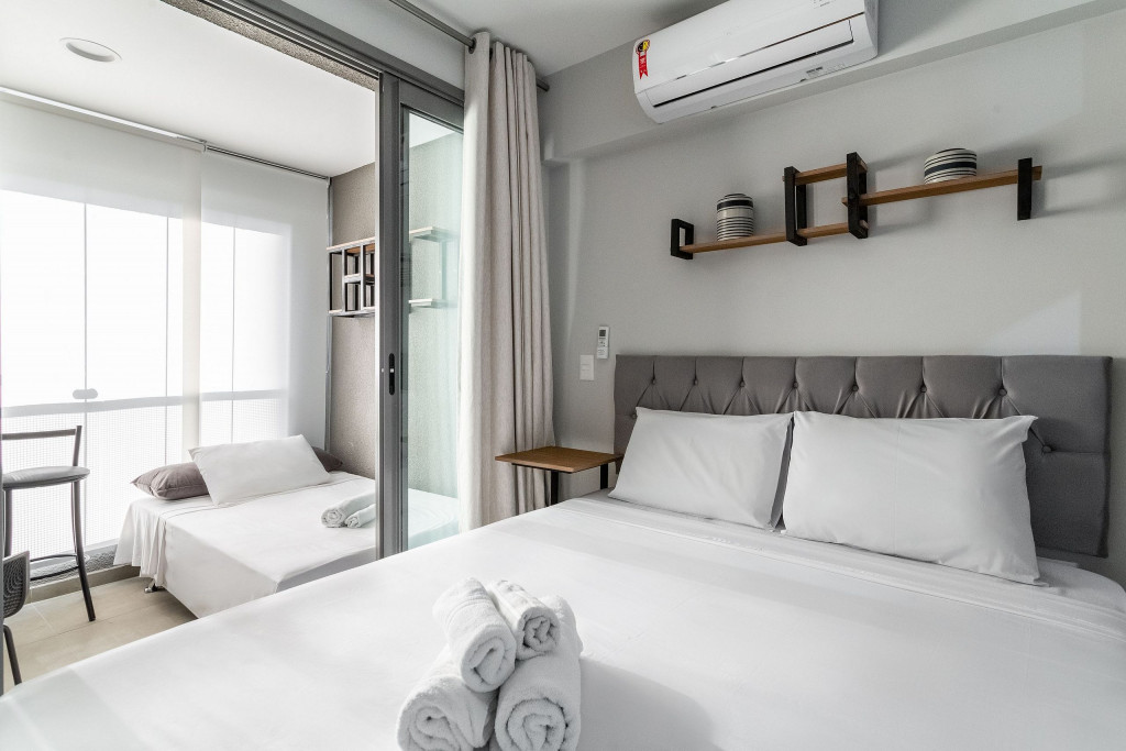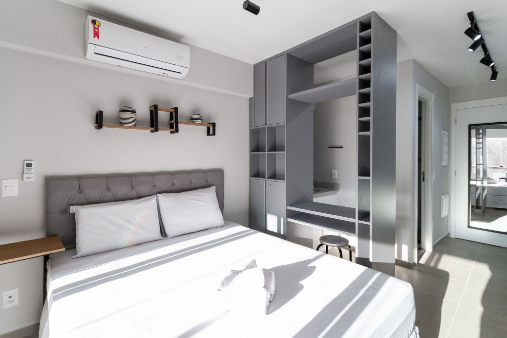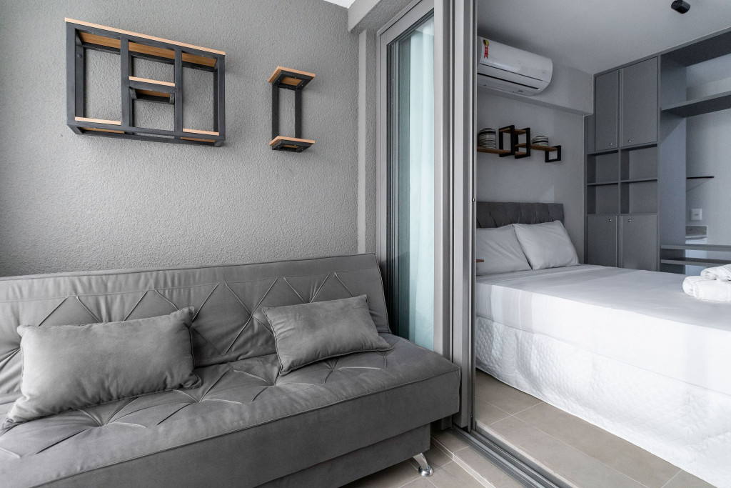 O ambiente do studio é em conceito aberto e acomoda até 2 pessoas em cama queen e 1 pessoa em sofá-cama na sacada.
