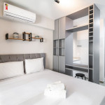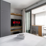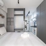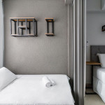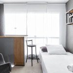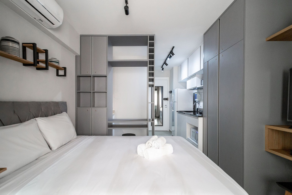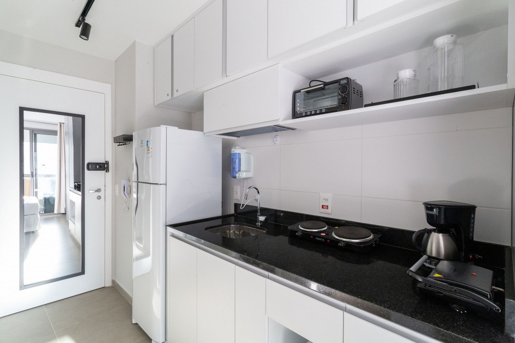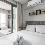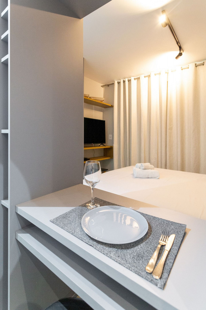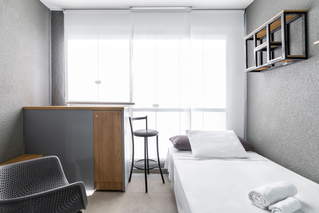 O ambiente do studio é em conceito aberto e acomoda até 2 pessoas em cama queen e 1 pessoa em sofá-cama na sacada.