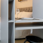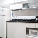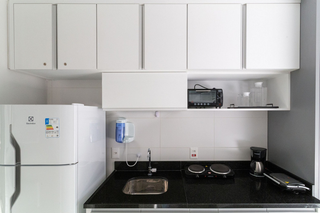 No mesmo ambiente dispomos de uma cozinha com utensílios necessários para a estadia, banheiro, armário, bancada com um banquinho para refeições.