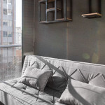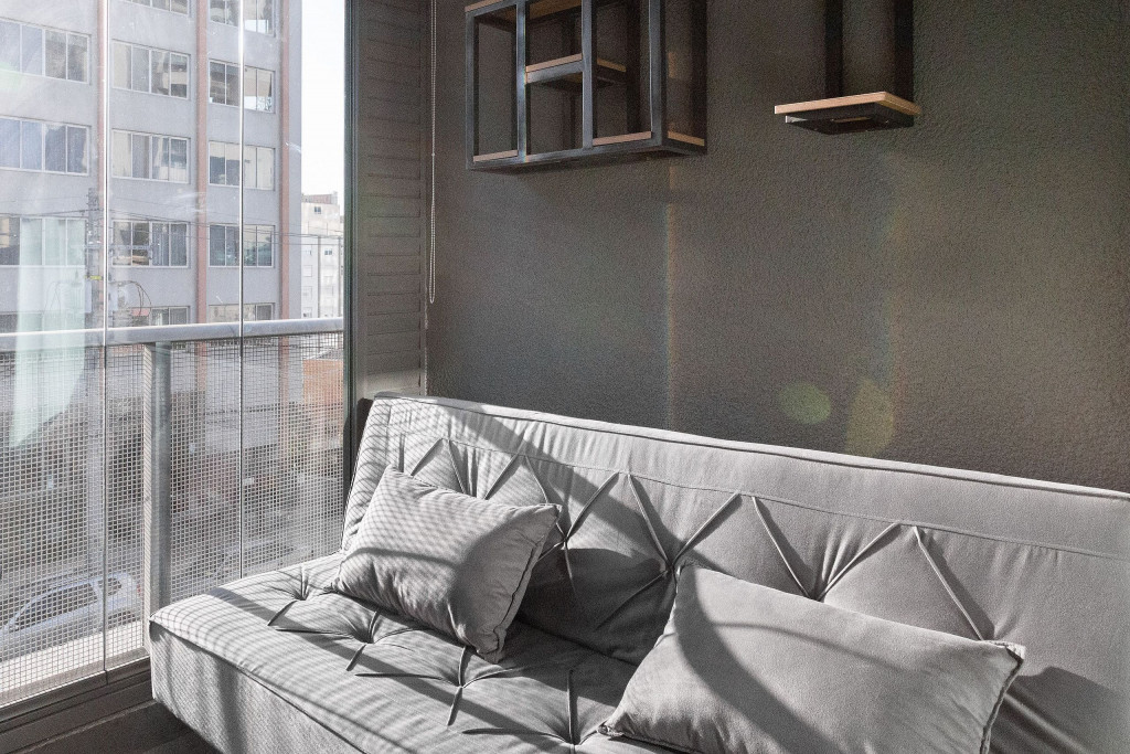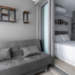 Para um ambiente mais aconchegante, contamos com cortina blackout na divisão do apartamento para a sacada.