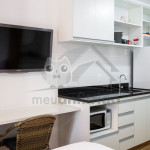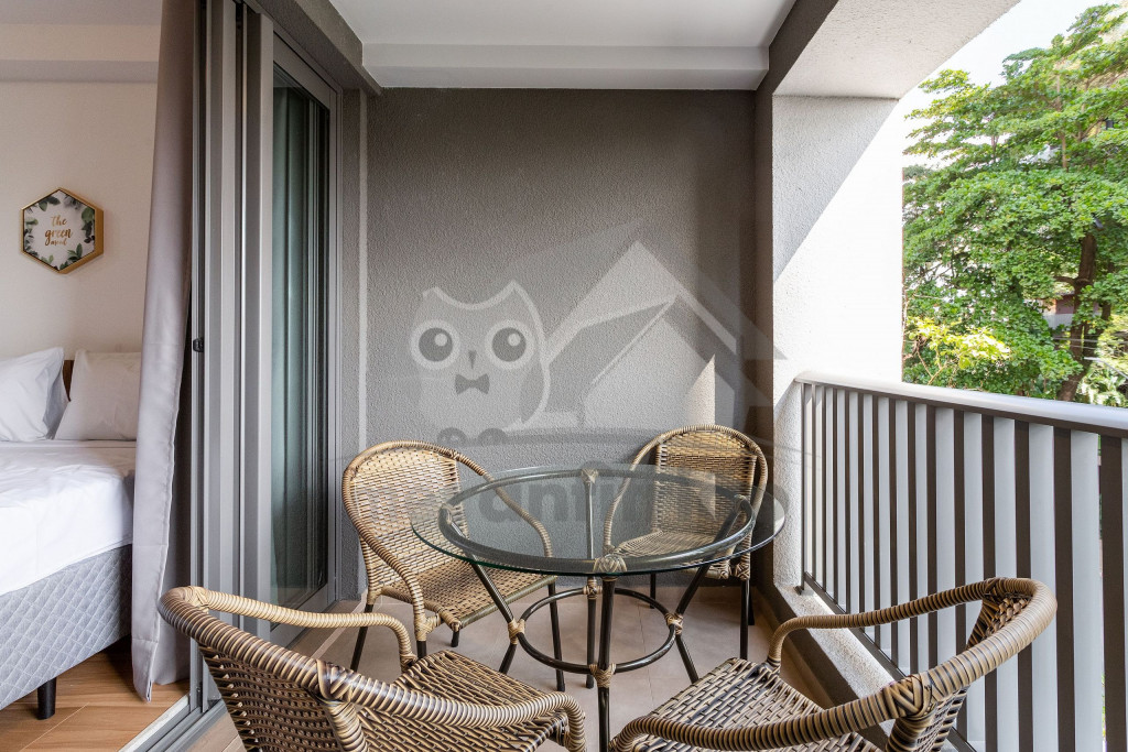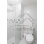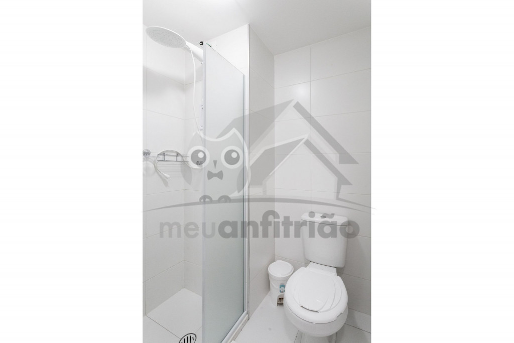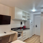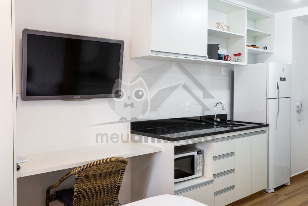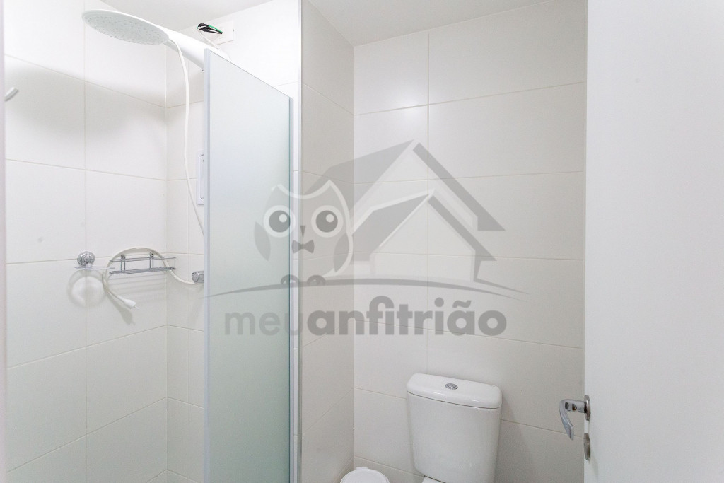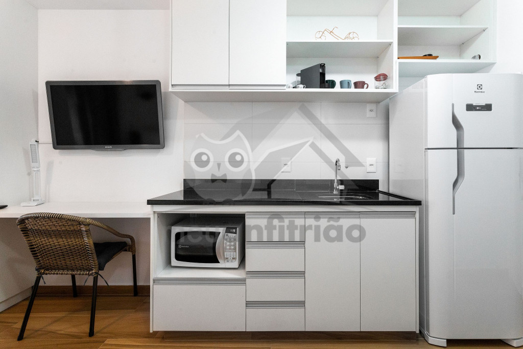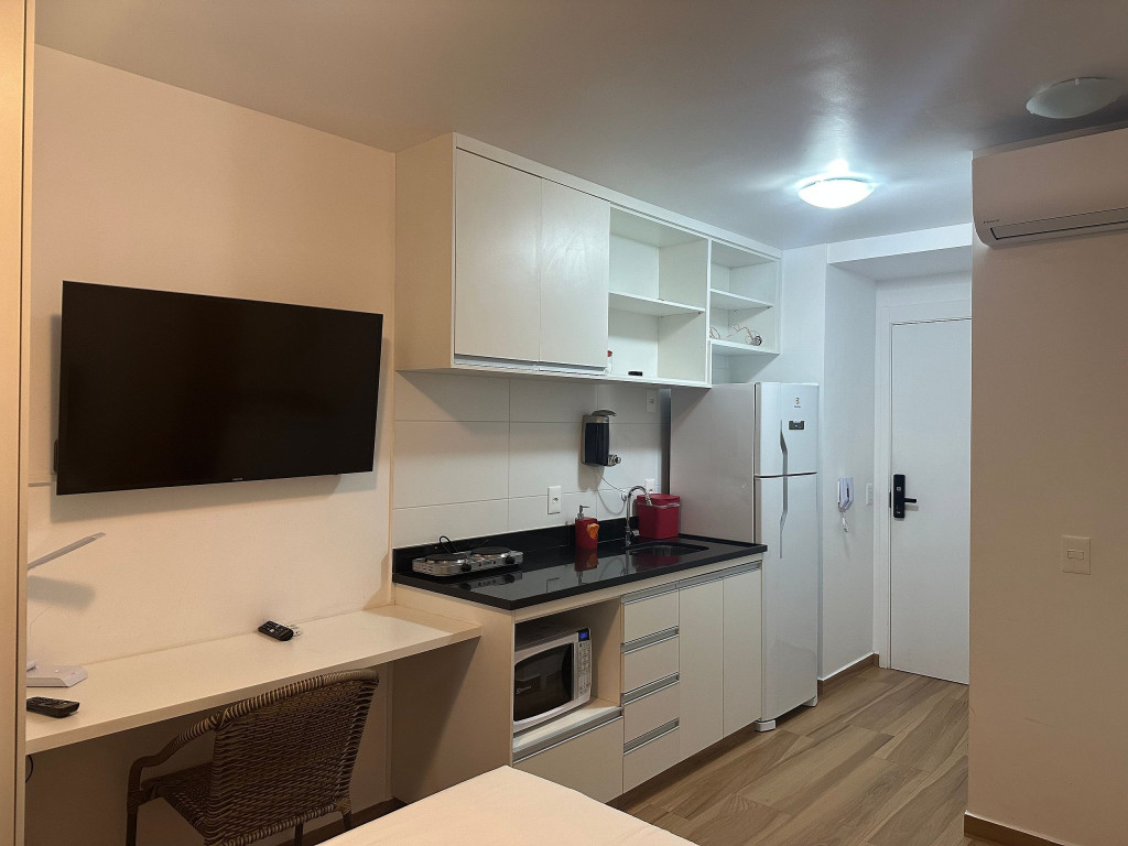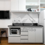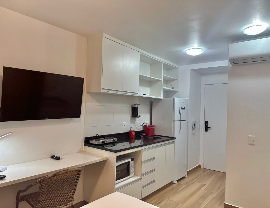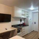 No mesmo ambiente dispomos de uma cozinha com utensílios necessários para a estadia, banheiro, armário, escrivaninha para home office, TV e cafeteira Nespresso, mas é necessário levar as próprias cápsulas. É possível comprá-las na loja de conveniência do condomínio que fica no térreo dentro do coworking.