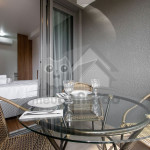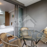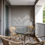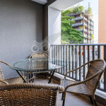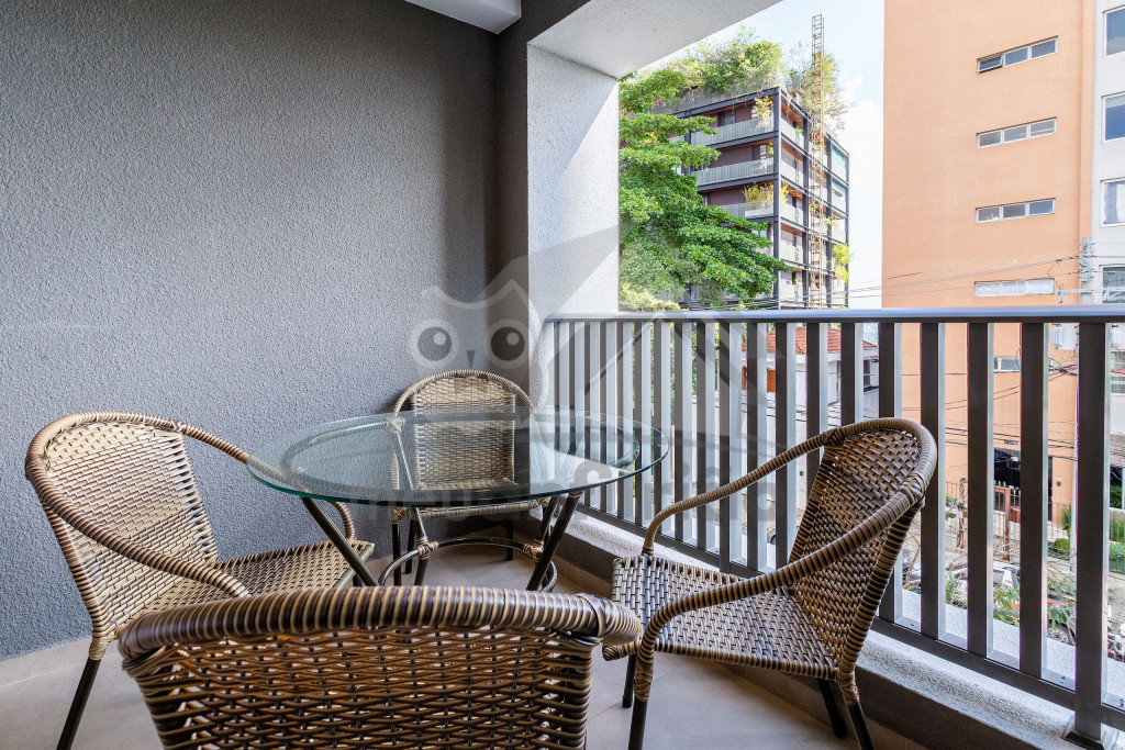 Uma varanda com porta de vidro separa os espaços. No local há uma mesa com cadeiras para fazer refeições e aproveitar o ambiente externo