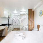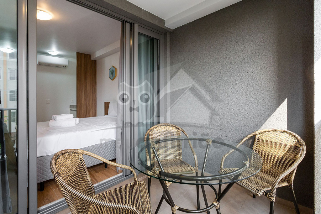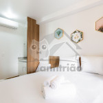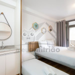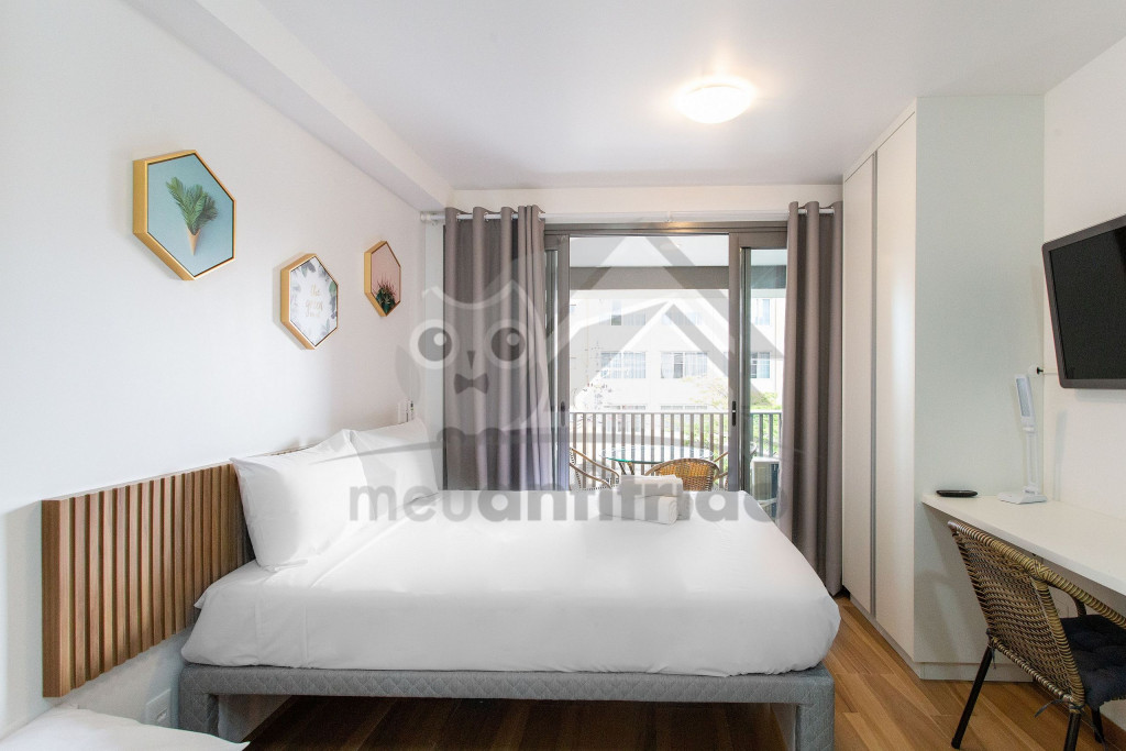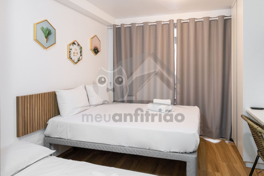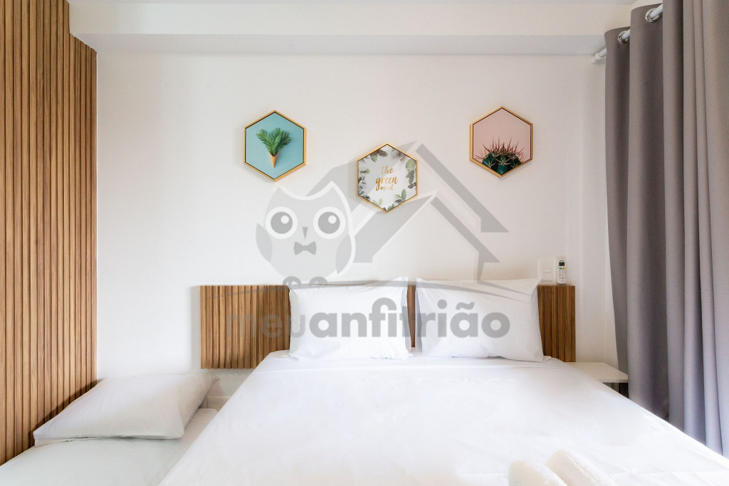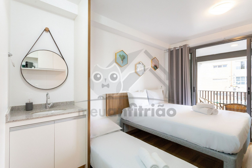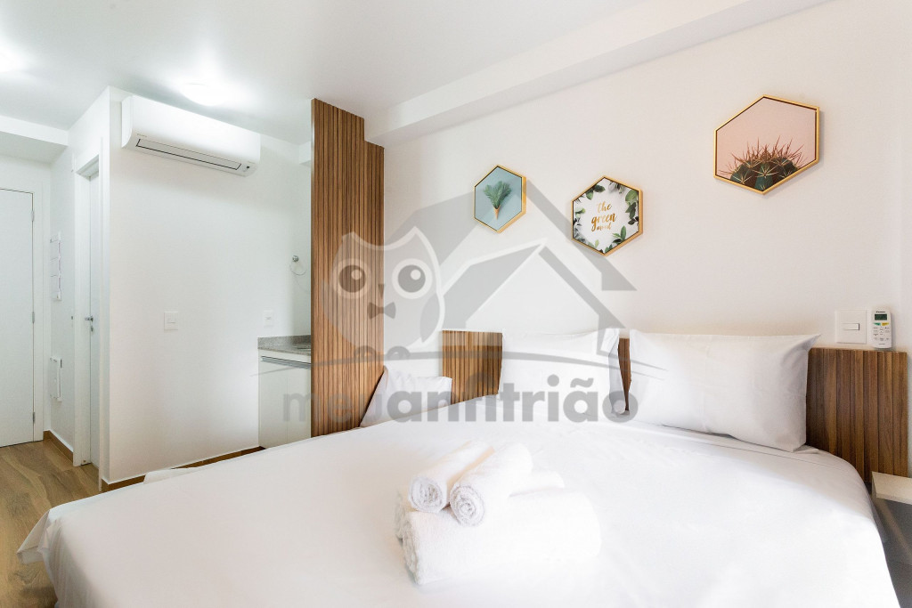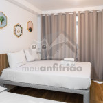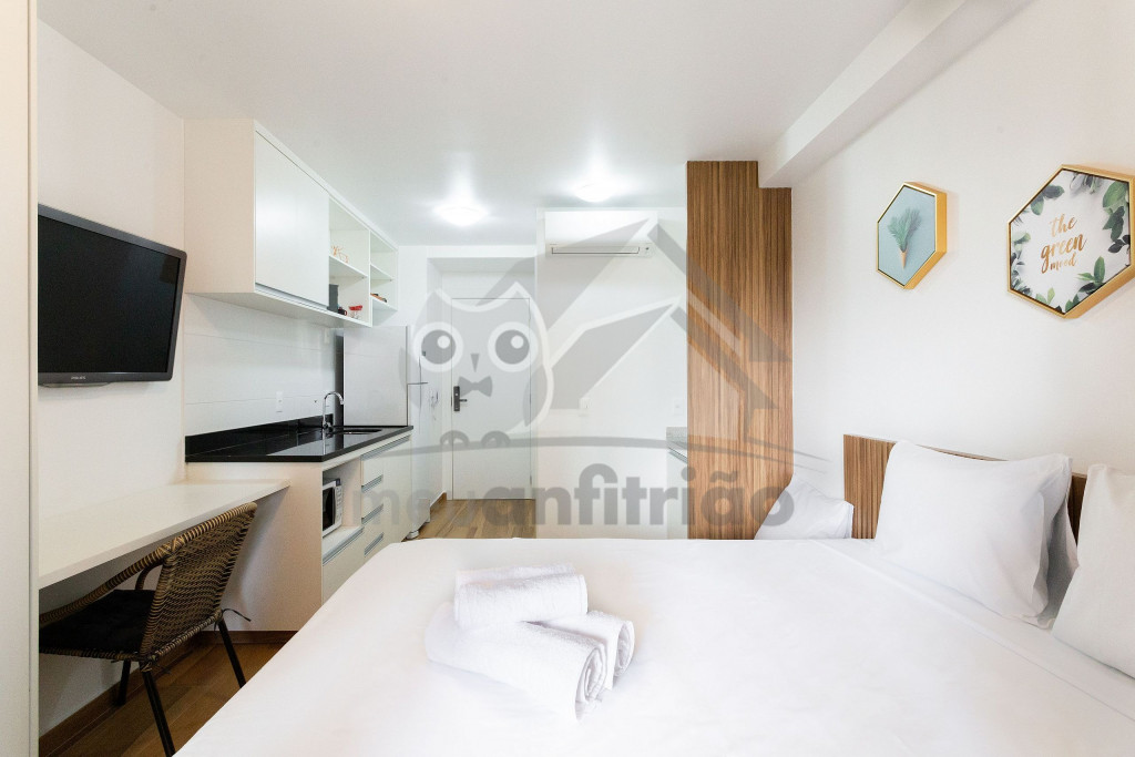 O ambiente do studio é em conceito aberto e acomoda até 3 pessoas, sendo 2 em uma cama de casal queen e 1 bicama.