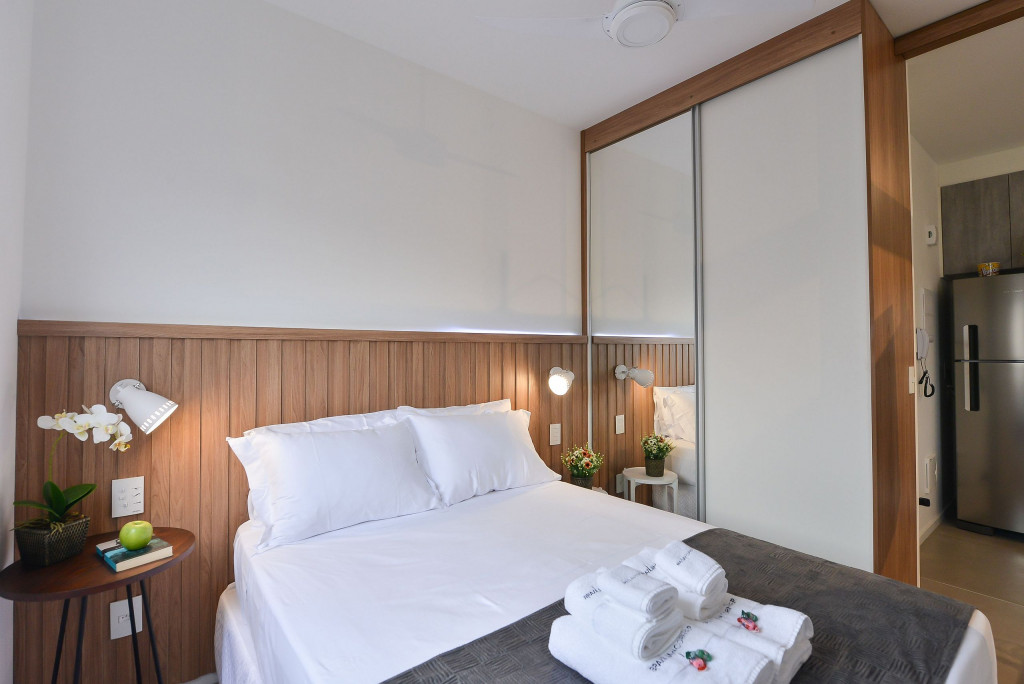 - Descrição detalhada do quarto: Um quarto com uma cama de casal. Além disto, nós disponibilizamos o enxoval completo de cama e banho. Desfrute do conforto dos lençóis macios e das toalhas felpudas que disponibilizamos para você. Nossa locação oferece um enxoval completo para garantir o máximo de conforto durante a sua estadia.