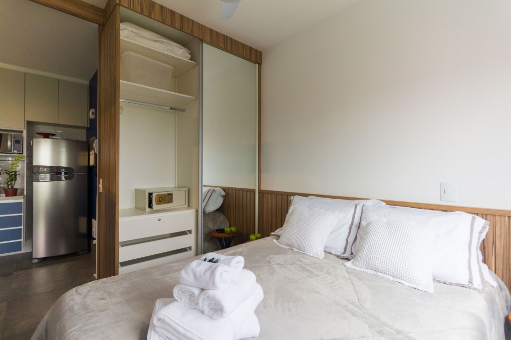 - Descrição detalhada do quarto: Um quarto com uma cama de casal. Além disto, nós disponibilizamos o enxoval completo de cama e banho. Desfrute do conforto dos lençóis macios e das toalhas felpudas que disponibilizamos para você. Nossa locação oferece um enxoval completo para garantir o máximo de conforto durante a sua estadia.