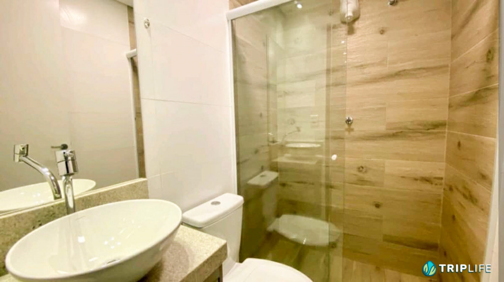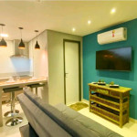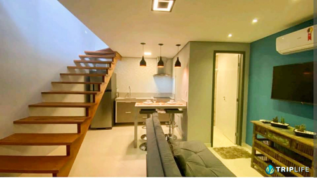 Conta com cozinha totalmente equipada, sala de estar com ar condicionado e smart TV e uma suíte com cama de casal e uma cama de solteiro com bicama.