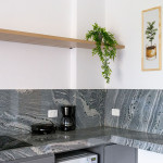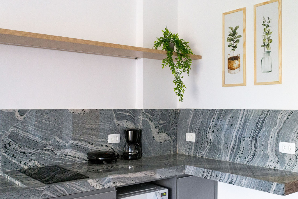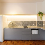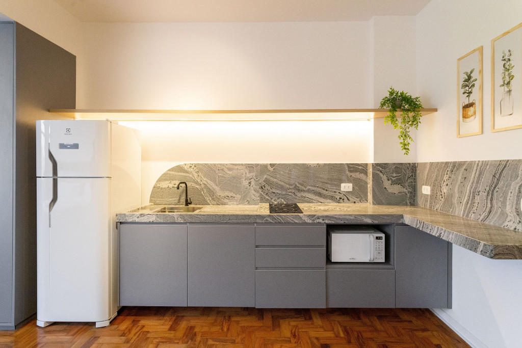 O studio é espaçoso e todo em conceito aberto. Logo ao entrar no imóvel, à direita, temos acesso à uma cozinha com utensílios e eletrodomésticos necessários para uma estadia prática, como fogão, microondas, geladeira, cafeteira, sanduicheira, filtro d’água, copos, talheres, taças e panelas. No armário de entrada, também dispomos de uma máquina lava e seca.