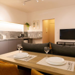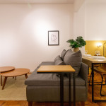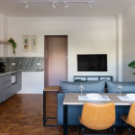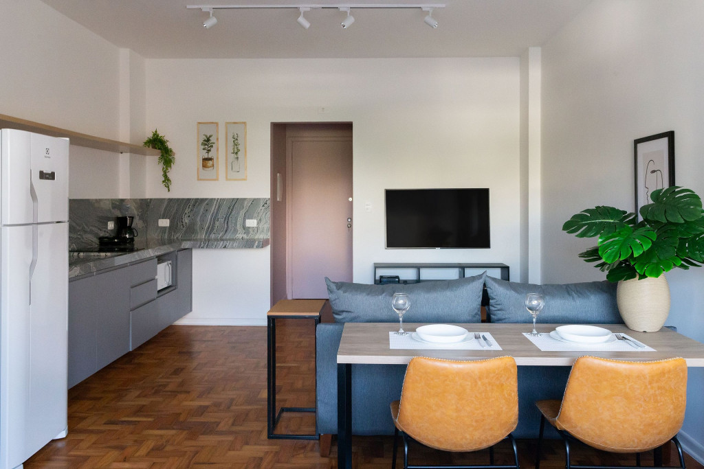 À esquerda temos um ambiente de sala com TV smart, mesa de centro e sofá. Também dispomos de uma mesinha de apoio para quem desejar trabalhar no sofá. Logo atrás do sofá, temos uma mesa para home office que também serve como mesa para refeições.