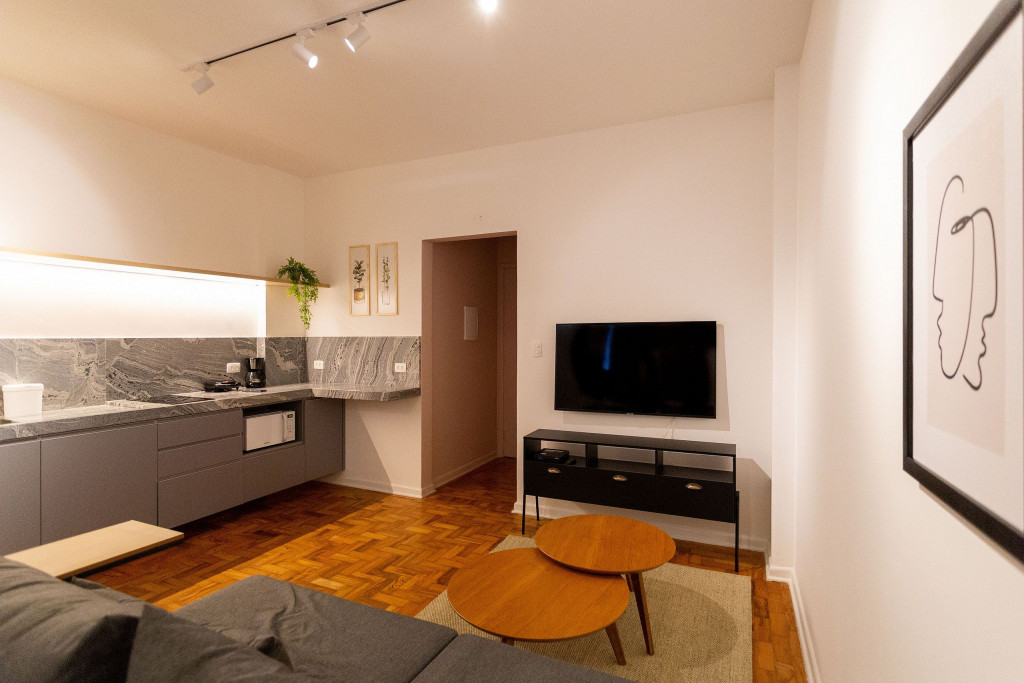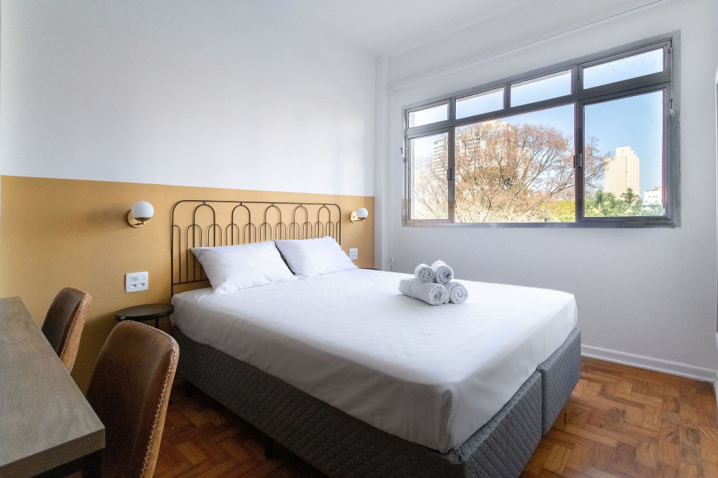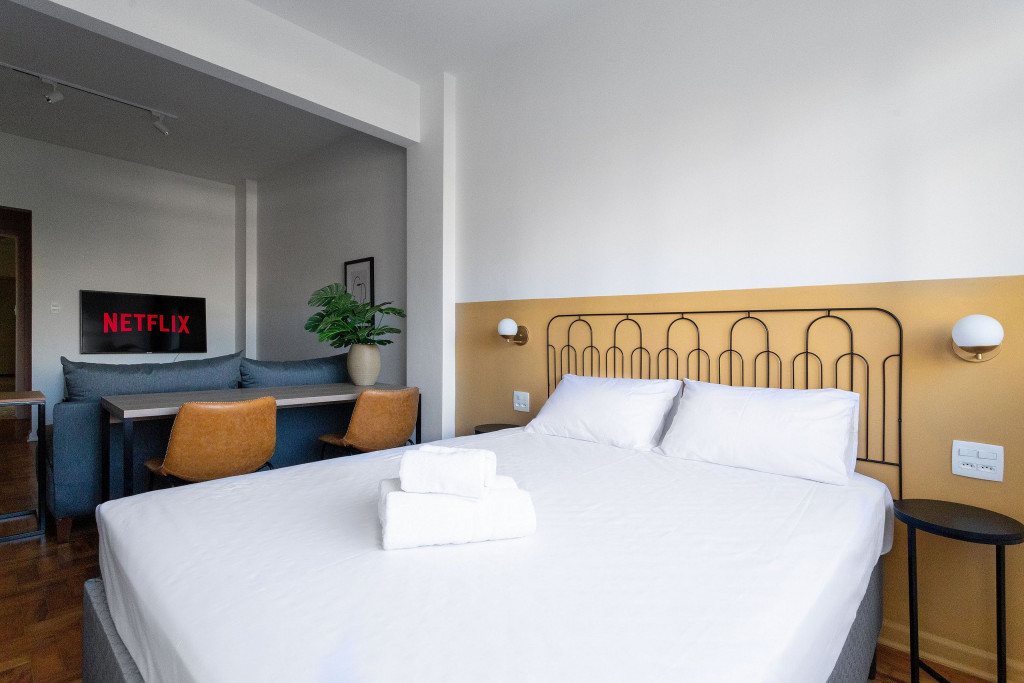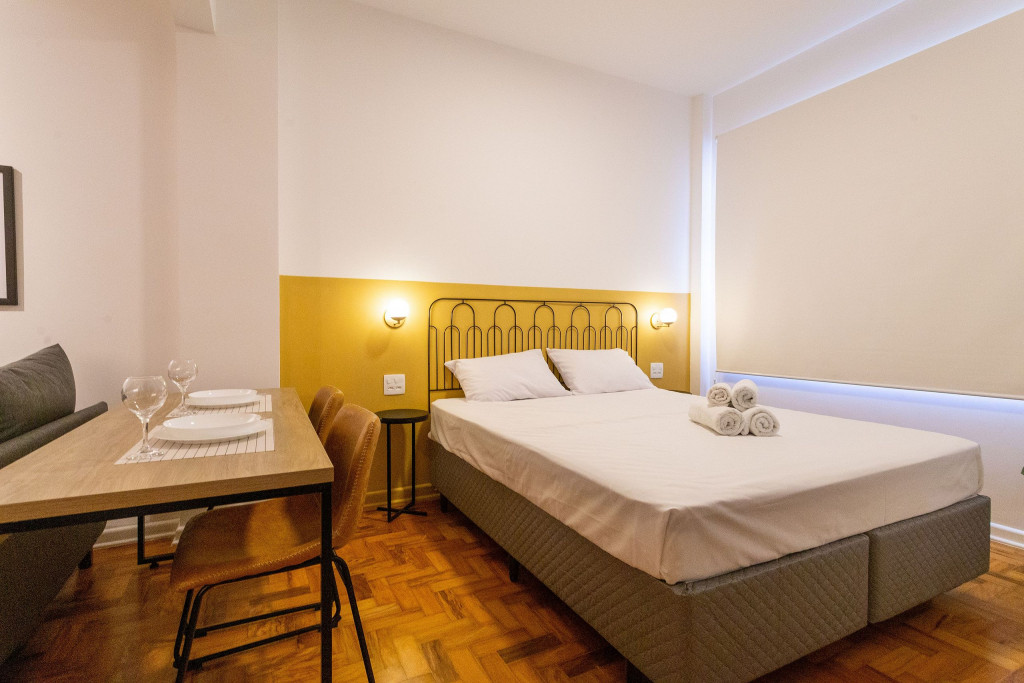 Situado em frente à Universidade Presbiteriana Mackenzie, na Avenida da Consolação, nosso studio de 42m2 acomoda confortavelmente até duas pessoas e é ideal para quem busca ótima localização em São Paulo.