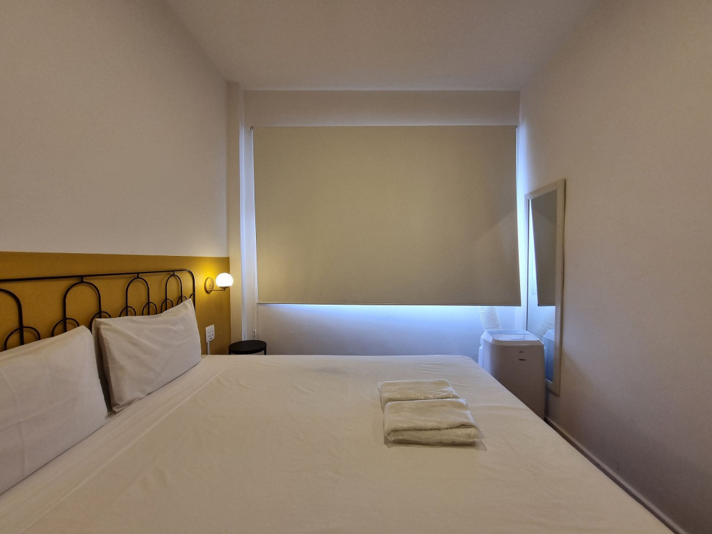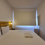 Ao fundo do studio, temos o ambiente do quarto com cama queen, ar-condicionado portátil quente e frio, armário com cabides, além de cortinas para maior conforto. O banheiro fica logo ao lado.