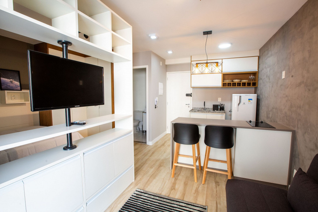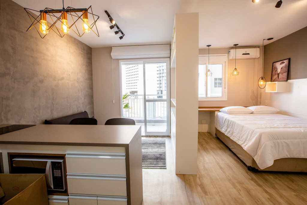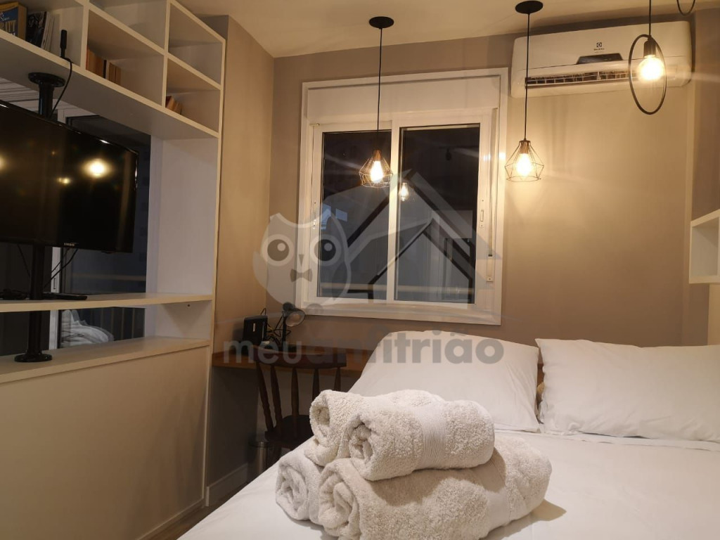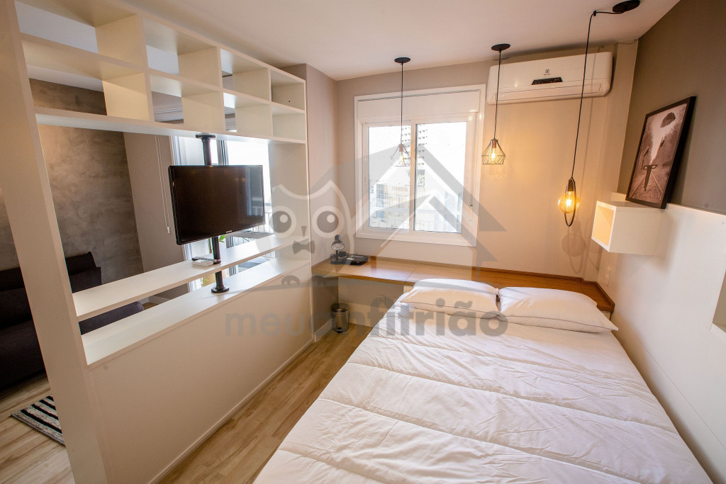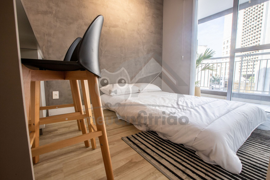 O Studio Republic, acomoda de maneira confortável até 3 pessoas, sendo: 2 pessoas em cama de casal e 1 pessoa em sofá-cama.Ao entrar no studio, à esquerda é possível encontrar uma cozinha completa com todos os utensílios e eletrodomésticos necessários para a estadia: fogão, micro-ondas, geladeira, cafeteira, copos, talheres, taças, panelas e muito mais.A cozinha é aberta e possui um balcão com duas baquetas para a sala. O local possui TV rotativa onde é possível focá-la tanto para o quarto quanto para a sala. Da sala, é possível acessar uma ampla e agradável varanda.Na área do quarto, há uma escrivaninha com cadeira para quem precisar fazer home office. Também oferecemos WI-FI de alta velocidade e ar-condicionado (quente e frio).O condomínio dispõe de bicicletário, recepção, academia moderna, mercadinho 24h e piscina com vista da cidade.