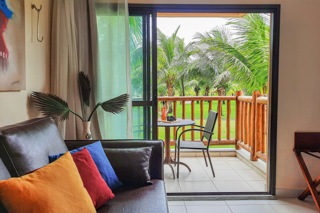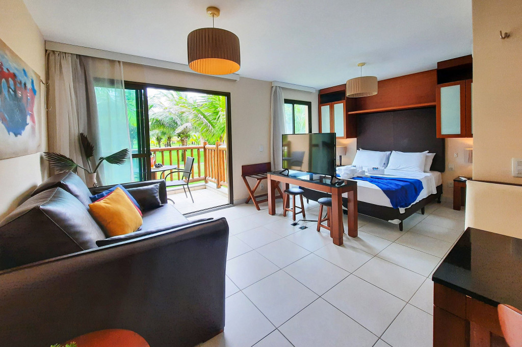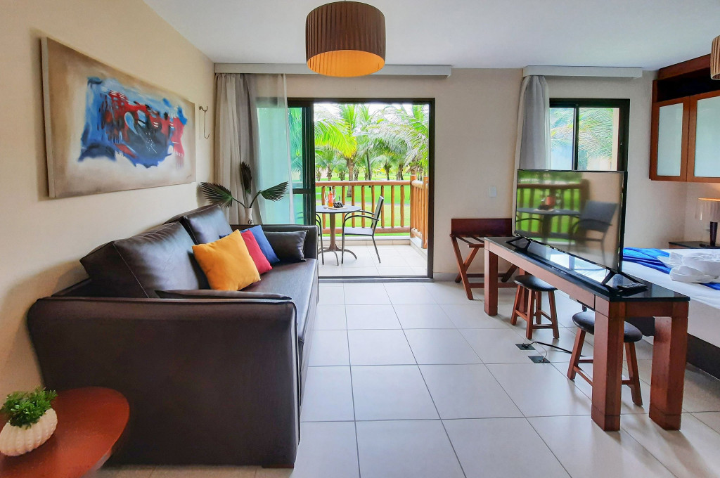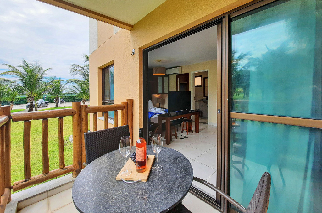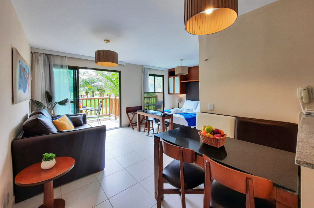 Belíssimo e confortável Studio no VG Sun Cumbuco, com 39m², localizado no térreo NASCENTE, decoração moderna e aconchegante, acesso via fechadura eletrônica, ar-condicionado que refrigera todos os ambientes, sala com sofá cama casal, TV Smart, cortinas blackout, varanda com mobília, banheiro completo (ducha quente), mesa de jantar com 4 lugares, cozinha completa com: geladeira frost free, Cooktop 4 bocas, sanduicheira, cafeteira, liquidificador, micro-ondas e demais utensílios de cozinha, wi-fi de alta velocidade (Fibra), 1 vaga na garagem, enxoval completo (cama, mesa e banho) e acomoda perfeitamente até 04 pessoas.