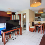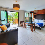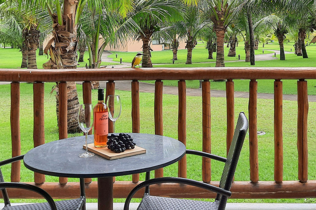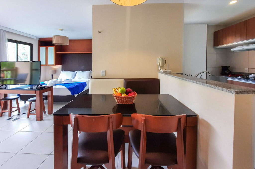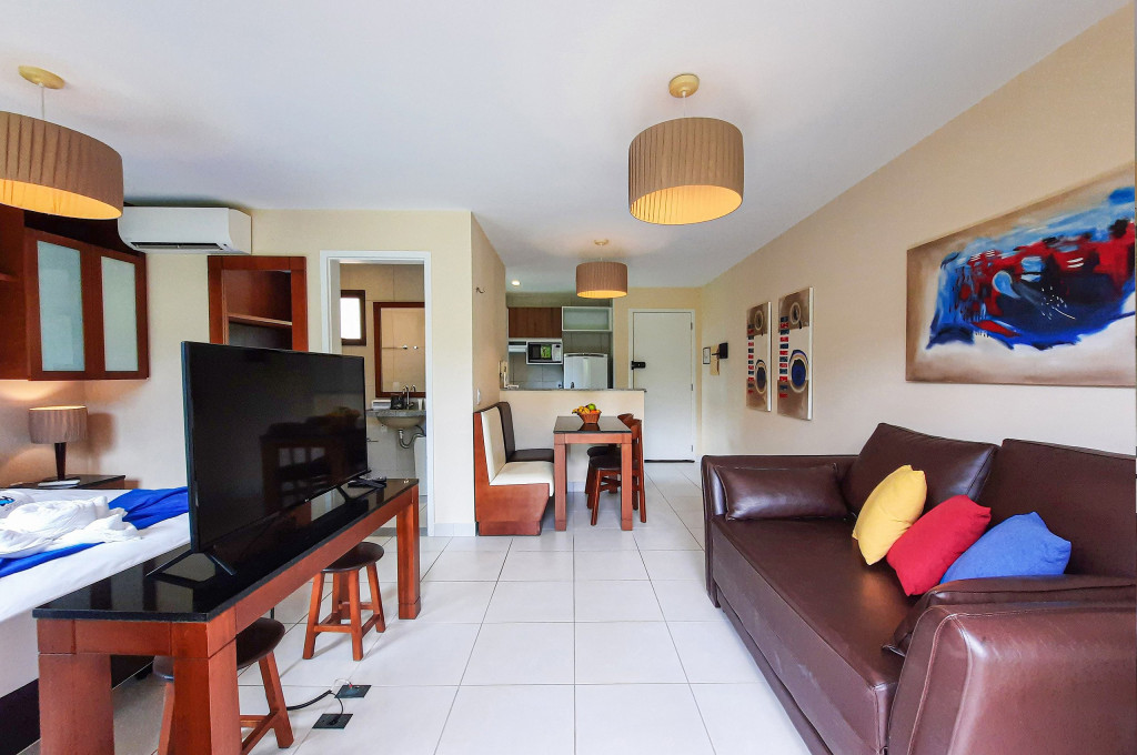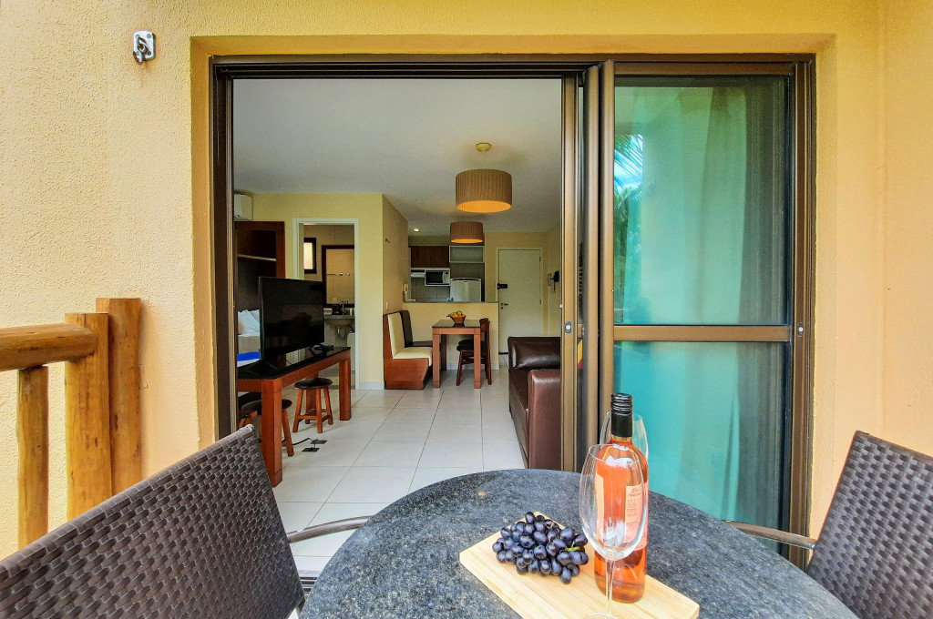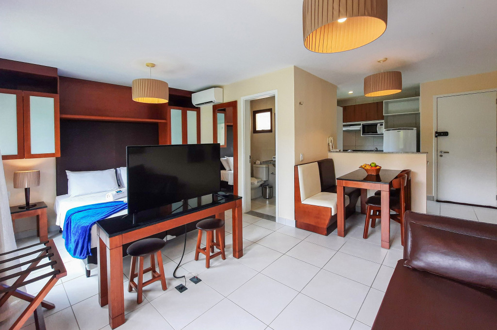 Belíssimo e confortável Studio no VG Sun Cumbuco, com 39m², localizado no térreo NASCENTE, decoração moderna e aconchegante, acesso via fechadura eletrônica, ar-condicionado que refrigera todos os ambientes, sala com sofá cama casal, TV Smart, cortinas blackout, varanda com mobília, banheiro completo (ducha quente), mesa de jantar com 4 lugares, cozinha completa com: geladeira frost free, Cooktop 4 bocas, sanduicheira, cafeteira, liquidificador, micro-ondas e demais utensílios de cozinha, wi-fi de alta velocidade (Fibra), 1 vaga na garagem, enxoval completo (cama, mesa e banho) e acomoda perfeitamente até 04 pessoas.