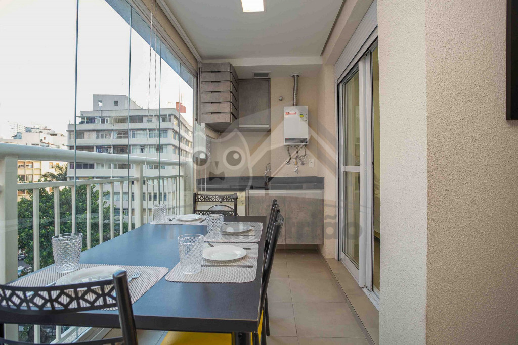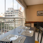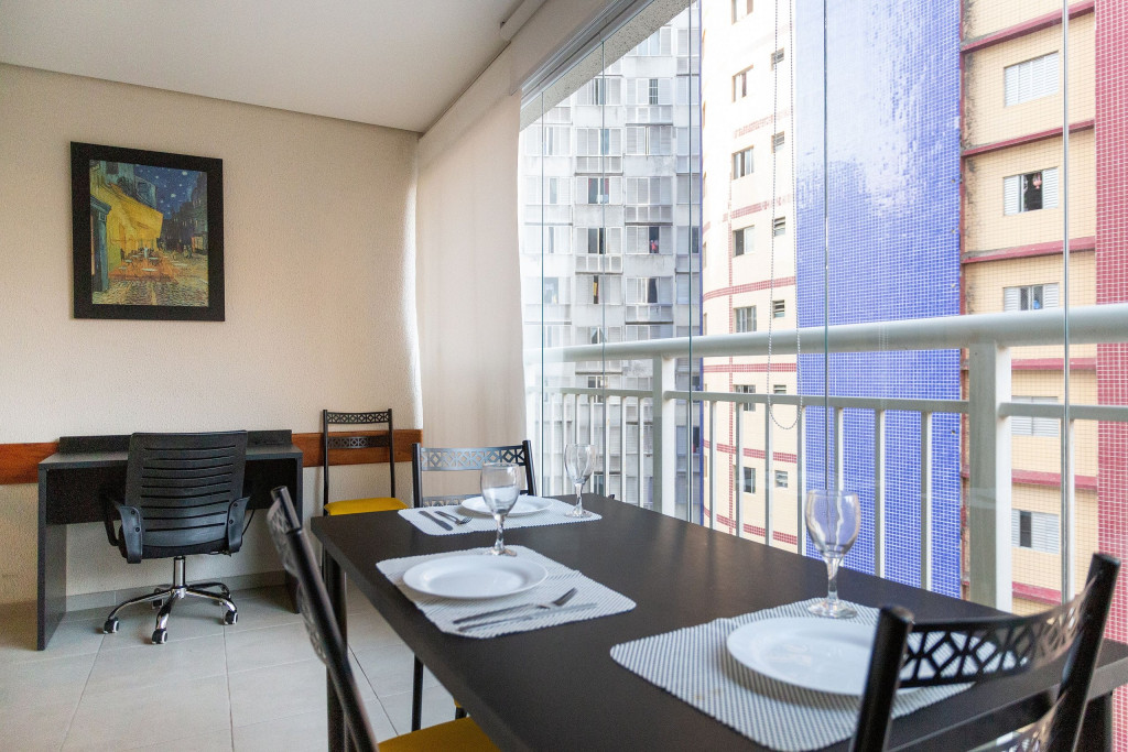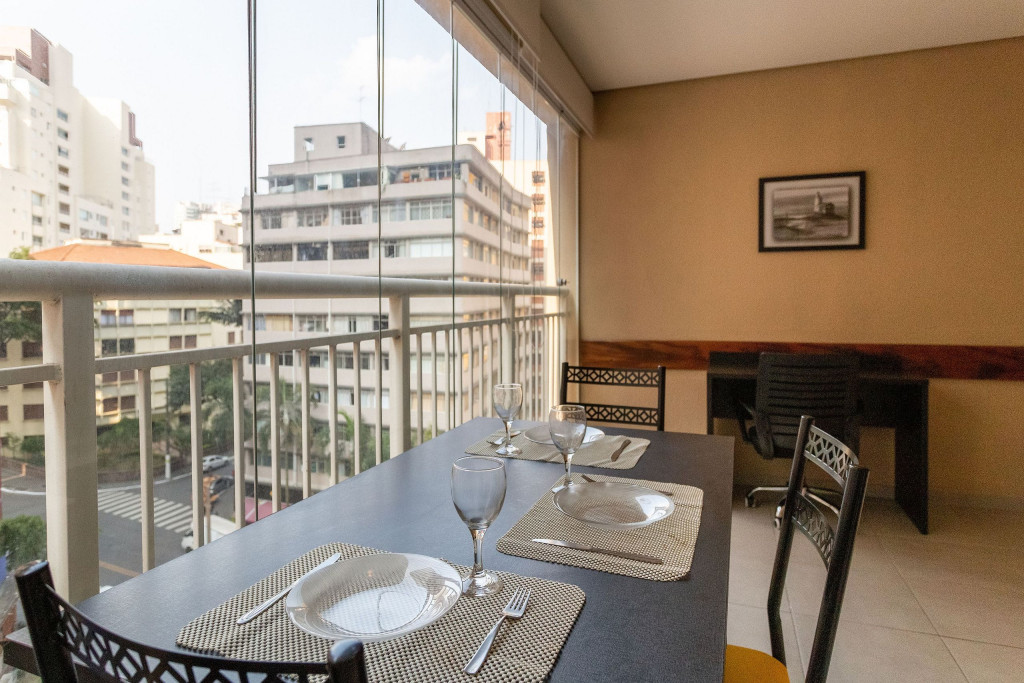 Uma varanda com porta de vidro separa os espaços. No local há uma mesa com cadeiras para fazer refeições e aproveitar o ambiente externo.