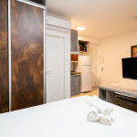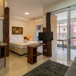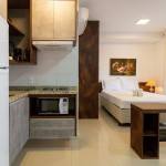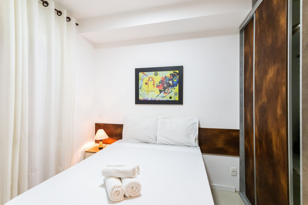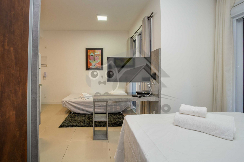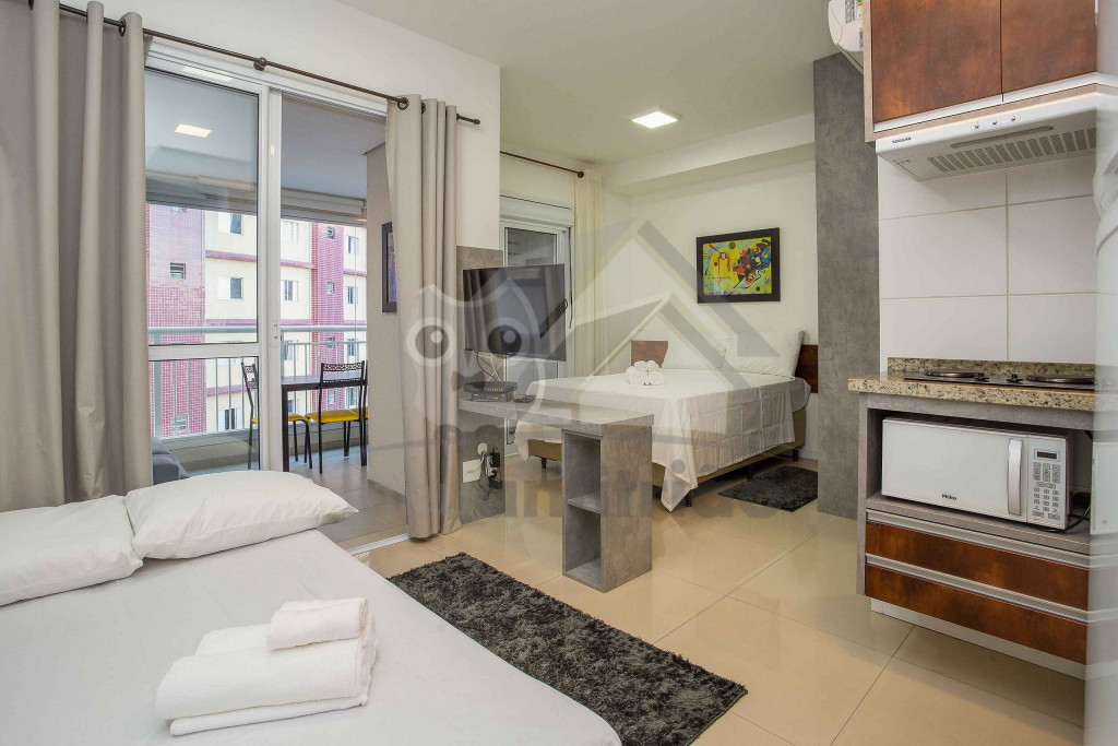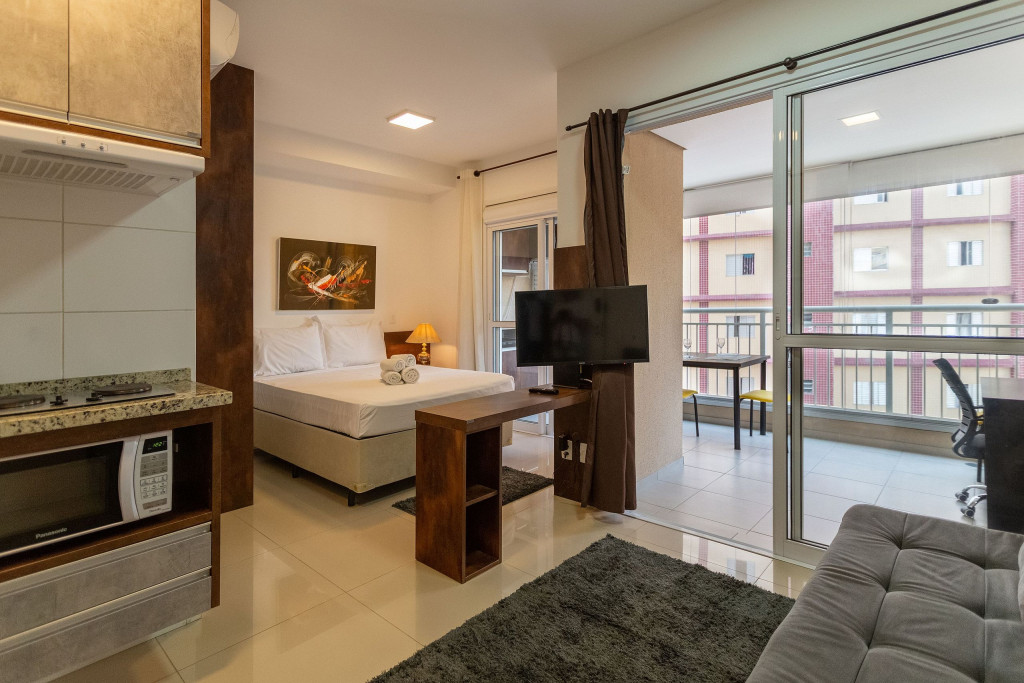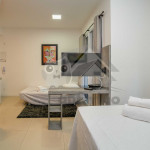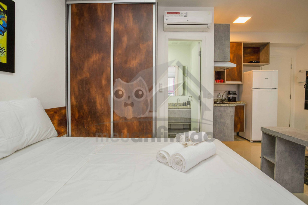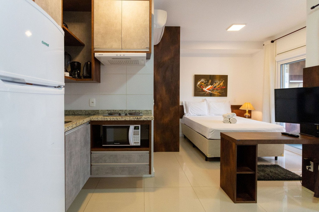 O ambiente do studio é em conceito aberto e acomoda até 3 pessoas em cama de casal e 1 em sofá cama na sala.No espaço, também dispomos de uma cozinha com utensílios necessários para a estadia, banheiro, TV e armário.