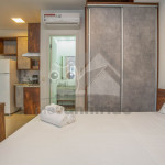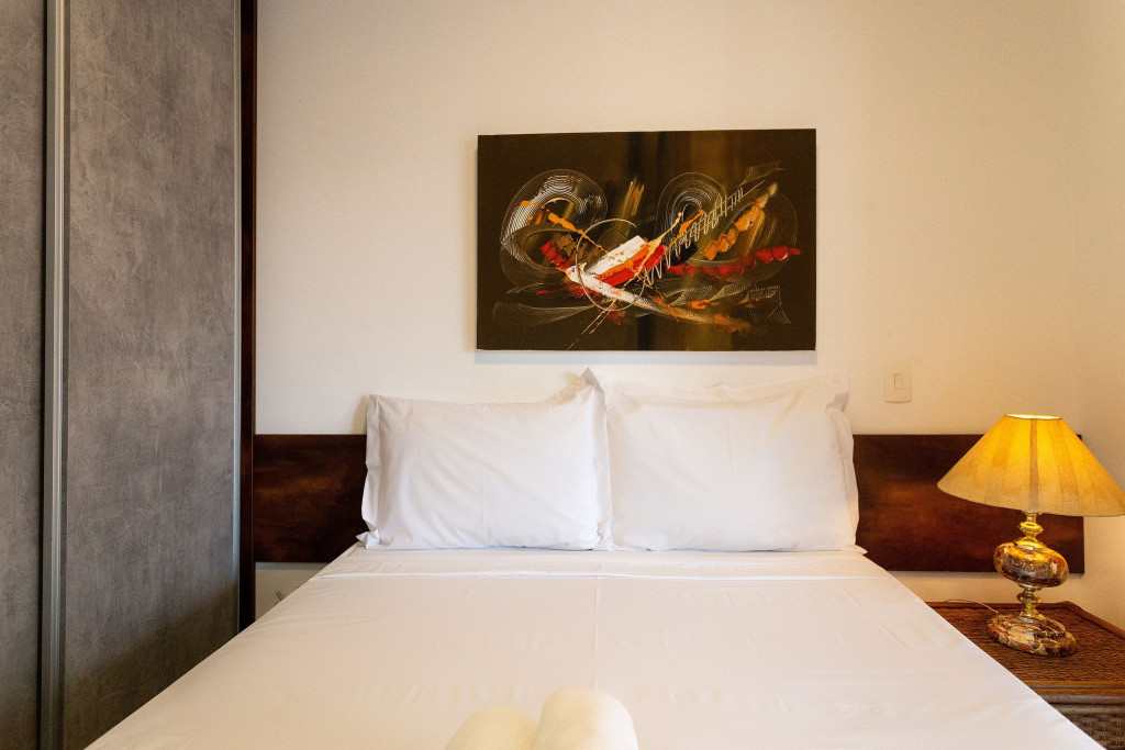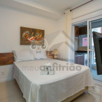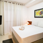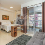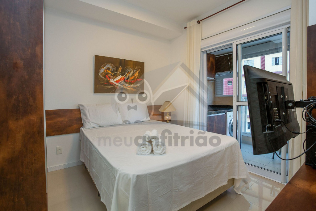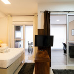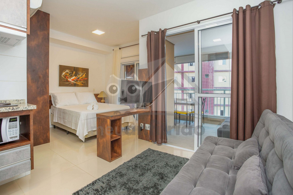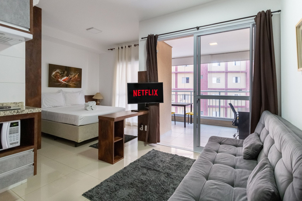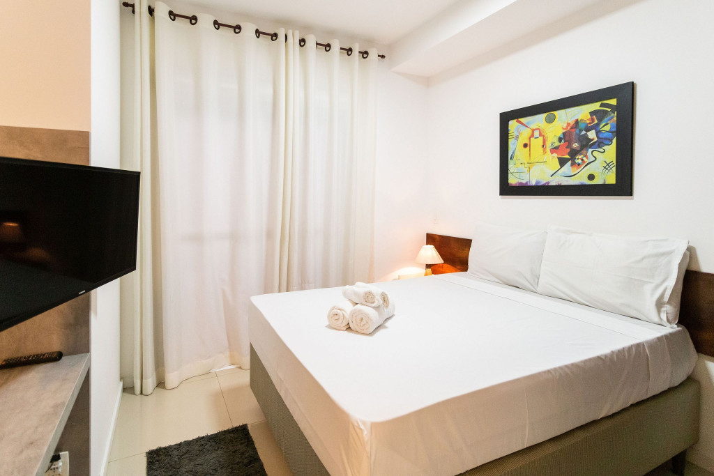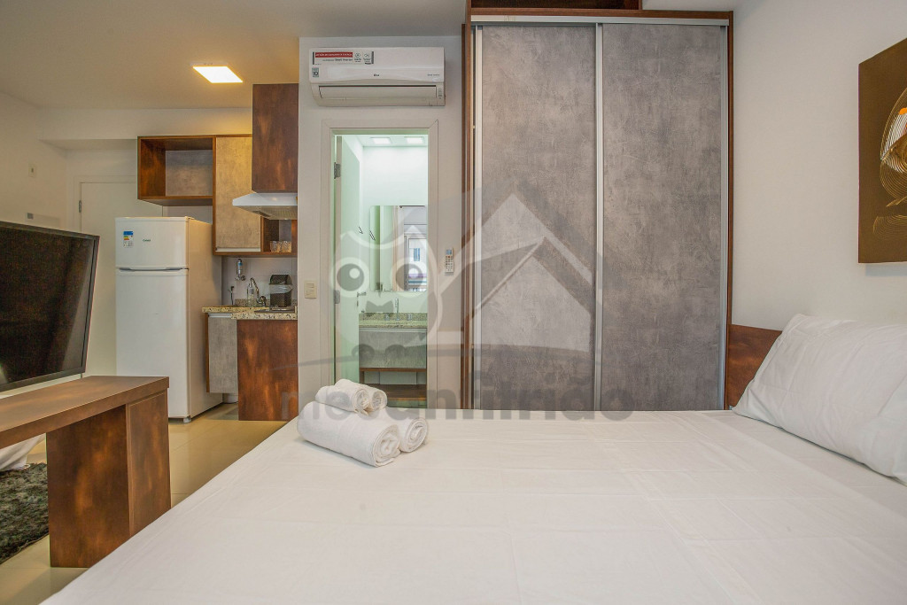 O ambiente do studio é em conceito aberto e acomoda até 3 pessoas em cama de casal e 1 em sofá cama na sala.