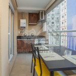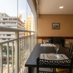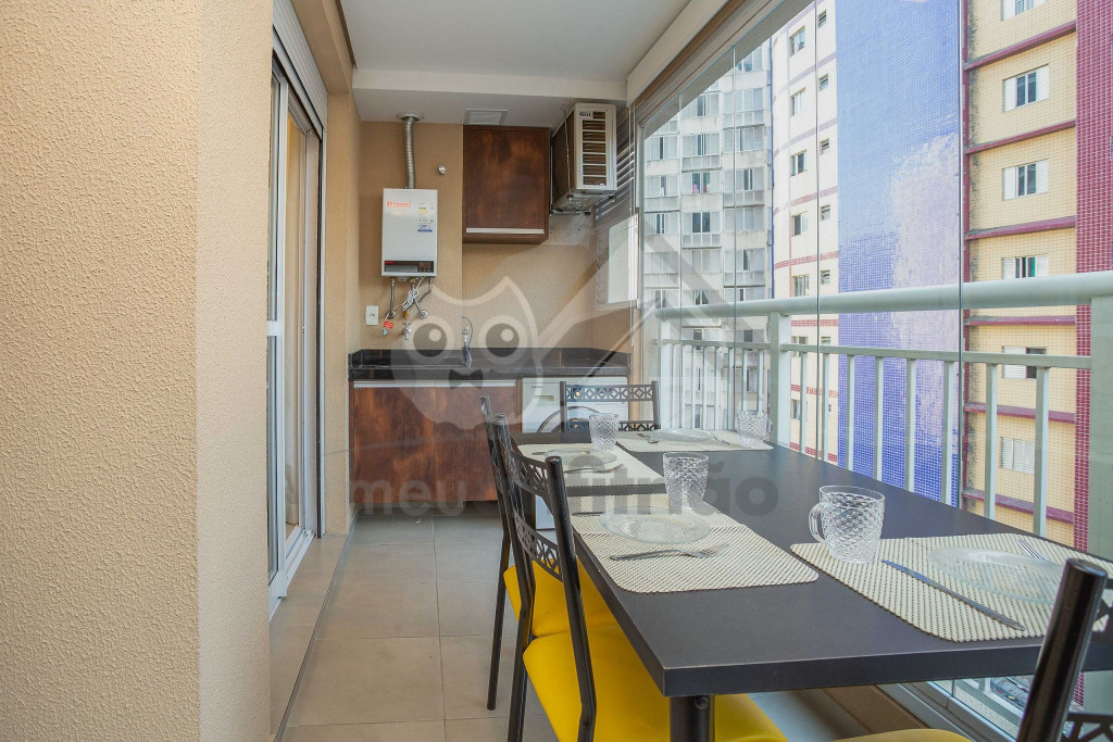 Uma varanda com porta de vidro separa os espaços. No local há uma mesa com cadeiras para fazer refeições e aproveitar o ambiente externo. No mesmo espaço, também temos uma máquina lava e seca.