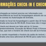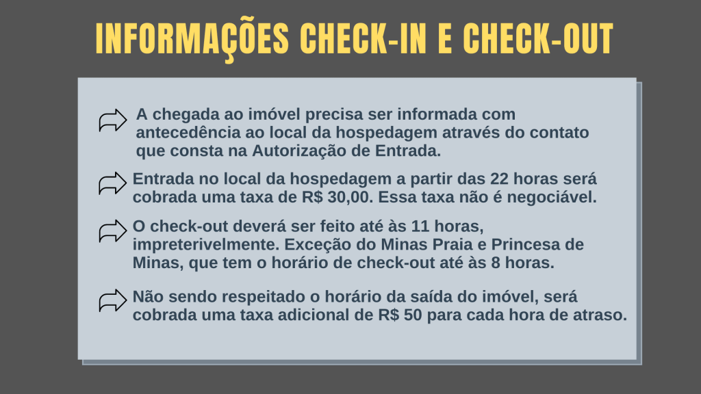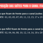 O check-out é até as 11 horas da manhã. Caso queira sair mais tarde, precisa pegar mais uma diária, mediante disponibilidade.As suítes de número impar tem vista para o canal de Itajuru. As suítes de número par ficam nos fundos.
