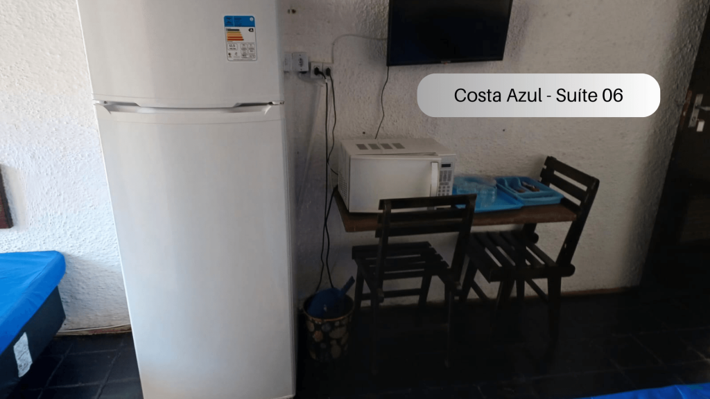 Suíte com quarto e banheiro a 9 minutos de carro da Praia do Forte. Localizada ao lado da Rua dos Biquinis, fica a 1 km do Centro de Cabo Frio. Há cama casal, duas camas de solteiro, geladeira, forno micro-ondas, ar condicionado, ventilador e TV. Há Wi-Fi disponível e estacionamento incluso no valor da hospedagem. Tem duas piscinas (uma de adulto e outra de criança). Comporta 4 pessoas. Não fornecemos roupa de cama, banho e nem produtos de higiene pessoal. Alugamos estes itens no local.