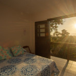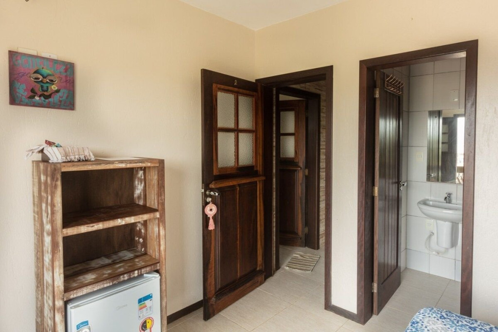 Nossa Suíte casal conta com 1 cama box casal, cadeira e armário para roupas, frigobar, banheiro privativo e varanda com linda vista da lagoa.