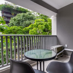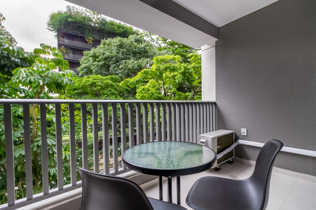 Há uma sacada que dá para a rua, para proveito do ambiente externo.