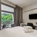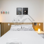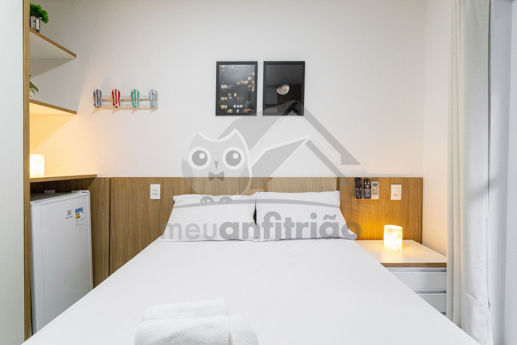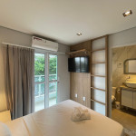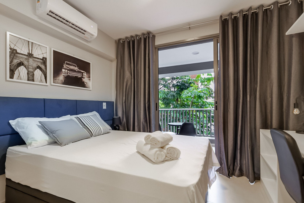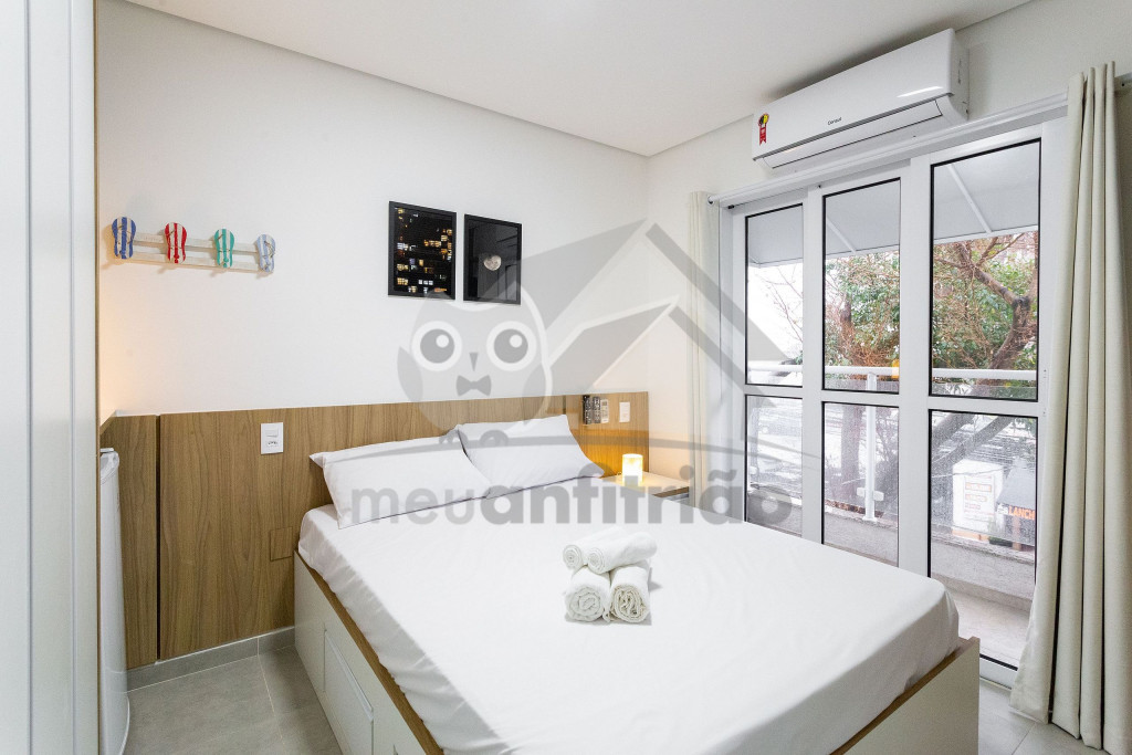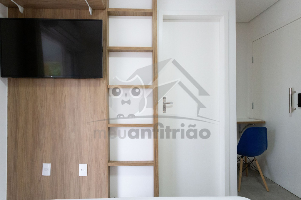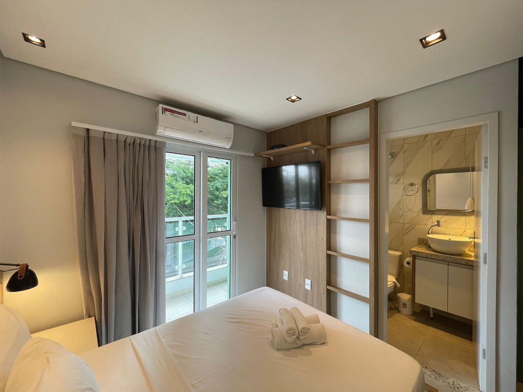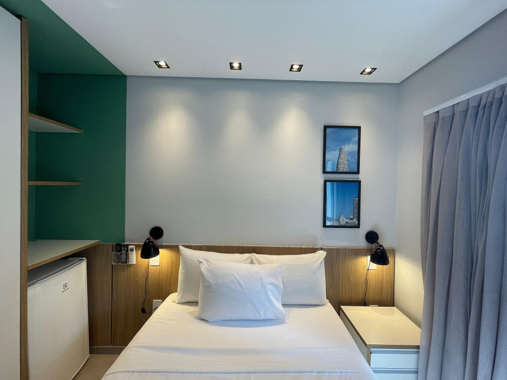 O quarto dispõe de ar-condicionado quente e frio, frigobar, armário, uma escrivaninha com cadeira para home office, além de um banheiro com chuveiro elétrico.